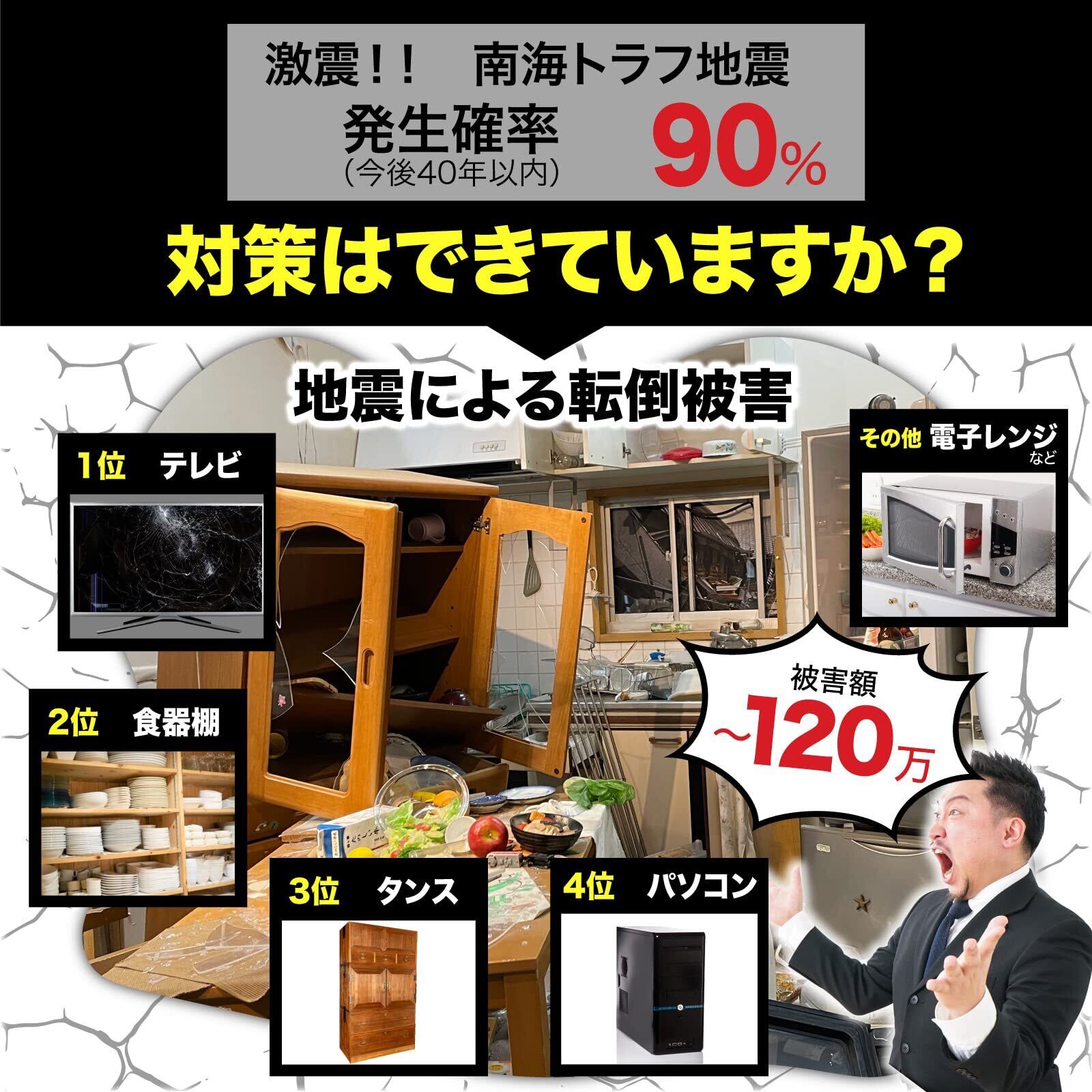 【新開発の耐震マット】驚異の粘着力により、貼るだけで転倒対策ができます。賃貸住宅で穴を開けられない場合でも、工事不要で設置することが可能です。厚さ5mmで耐荷重100kg(4枚ご使用時)の耐震ジェルです。子供やペットのいたずらによる、転倒防止にも役立ちます。