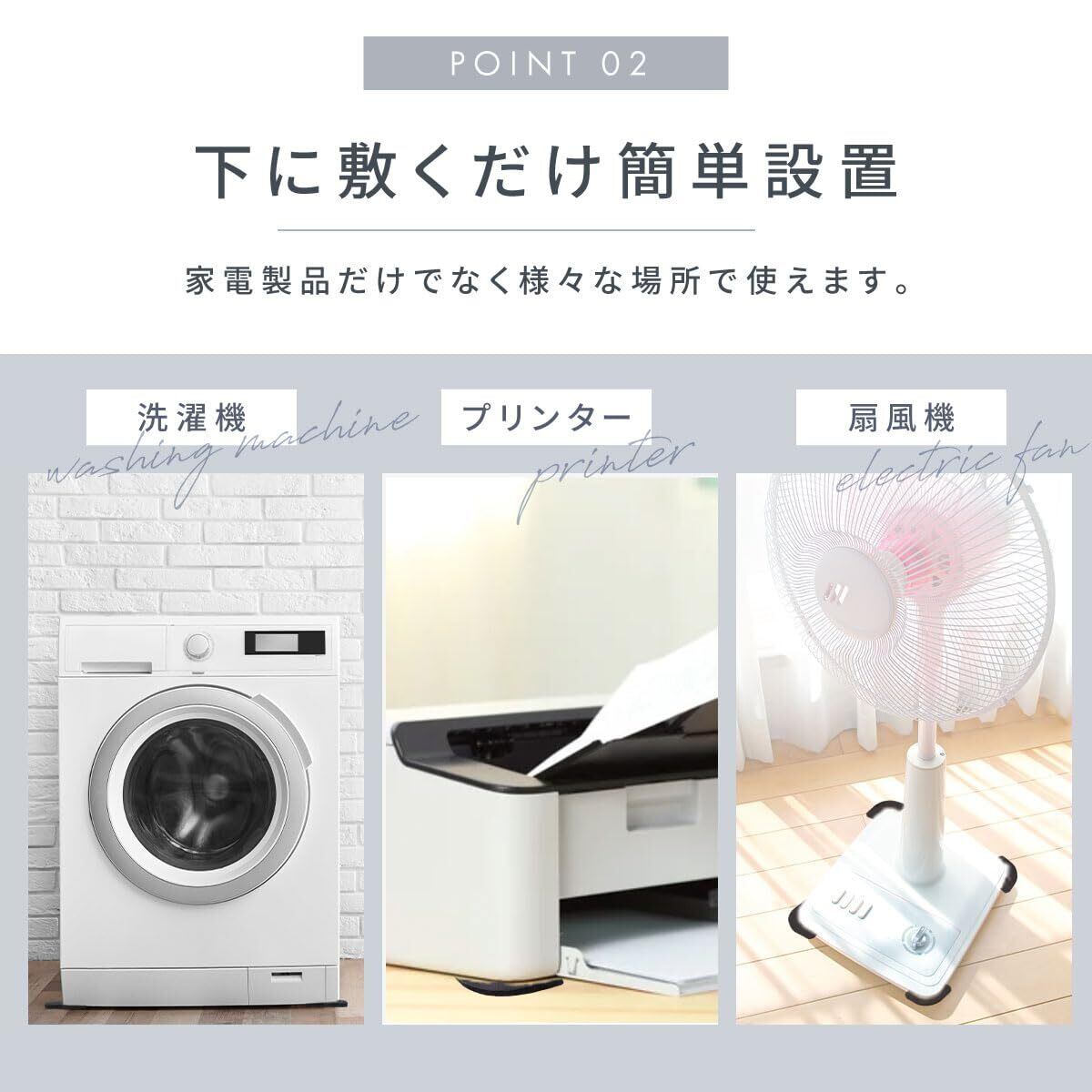 下に敷くだけの簡単設置なので、洗濯機、プリンター、扇風機など様々な場所で使えます。