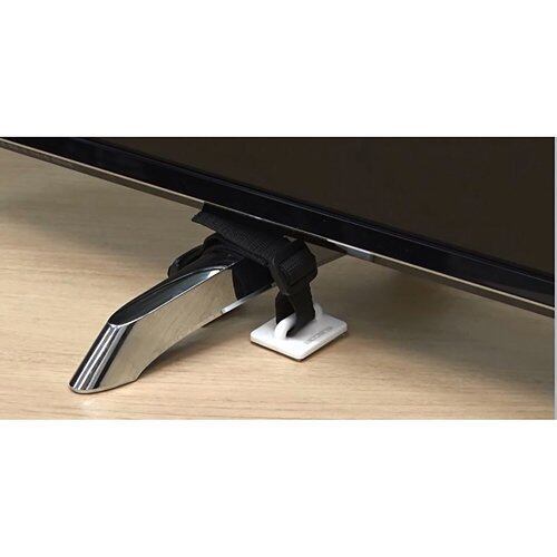 ■ ベルト長さを調整して、テレビの脚をまたぐように固定します。バランスよく配置することで、前方への転倒を防止します。