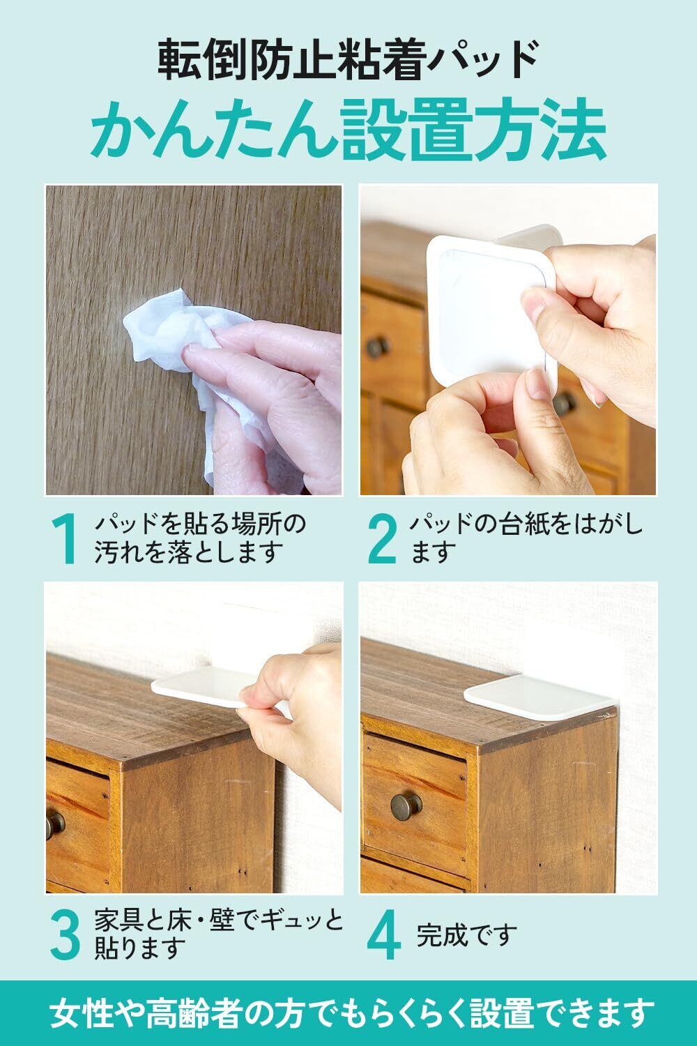 【 低い家具でも取り付けOK 】 つっぱり棒タイプだと届かない、低い家具にも取り付けられます。お子さんがよじ登った際に転倒してしまうリスクも減らせます。
