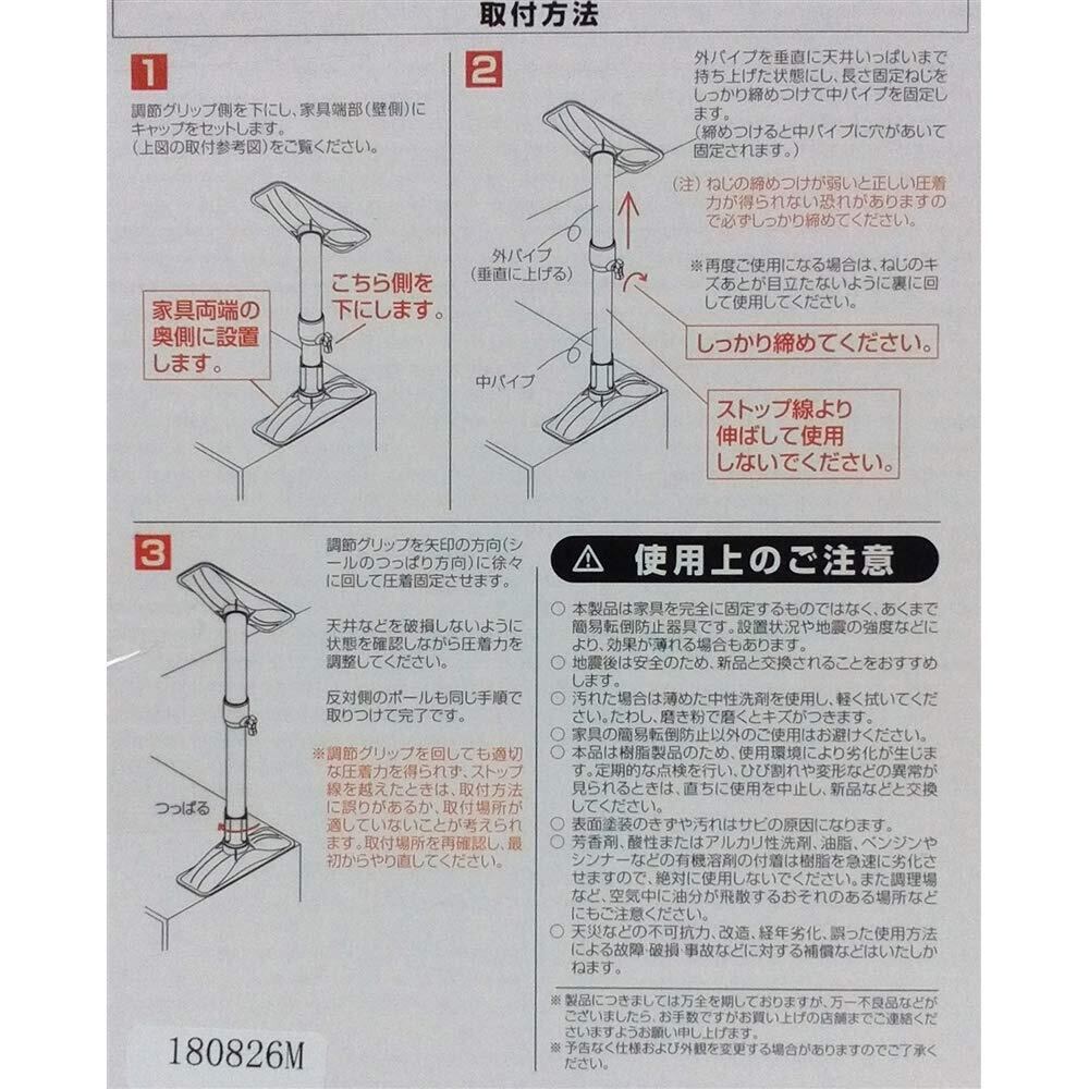 【特長】 ●ご家庭で簡単に防災!地震対策の必需品! 【仕様】 ●材質表示:パイプ類/鉄パイプ:エポキシ樹脂粉体塗装 樹脂部品/ABS樹脂・EVA樹脂 ねじ類/鉄製:メッキ仕上げ ●キャップサイズ:(約)幅72×奥行212mm ●パイプ径:(約)29mm・25mm ●耐圧:(約)200kg ●中国製 ●入数 2本
