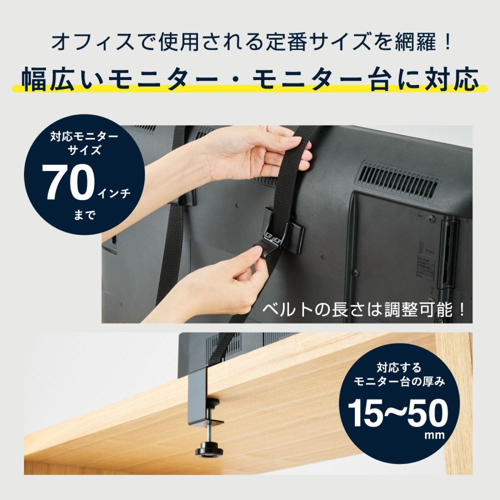 ベルトの長さ調節が可能で、最大70インチ・64kgまでの大型モニターやテレビにも対応します。