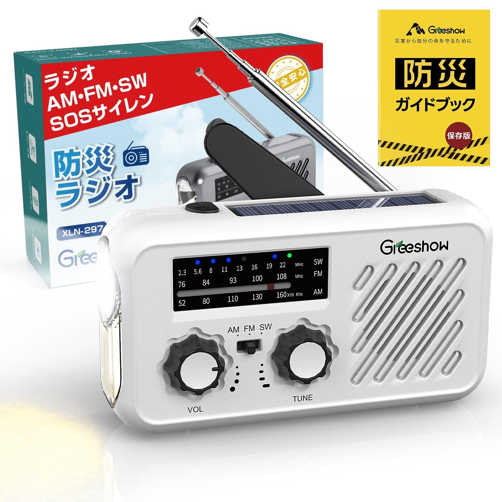 Greeshow 防災ラジオ 多機能 携帯ラジオ SW/AM/FM 手回しラジオ (FM周波数76Mhz-108MHz) SOSアラート付き ソーラー充電 災害ラジオ 小型 防水 3.5mmイヤホンジャック付き 2000mAhバッテリ キャンプ 緊急用 非常用 USB充電 スマホ充電可能 LEDライト PSE技術適合 防災ガイドブック付き XLN-297 | 毎日発送✿はなまる