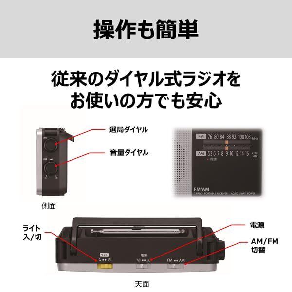 見やすい文字と光るランプ:大きな文字の選局パネルと、ピタッと正確にチューニングできる光る同調ランプを搭載。暗い場所でも、ラジオに不慣れな方でも、直感的に目的の局を探すことができます。
