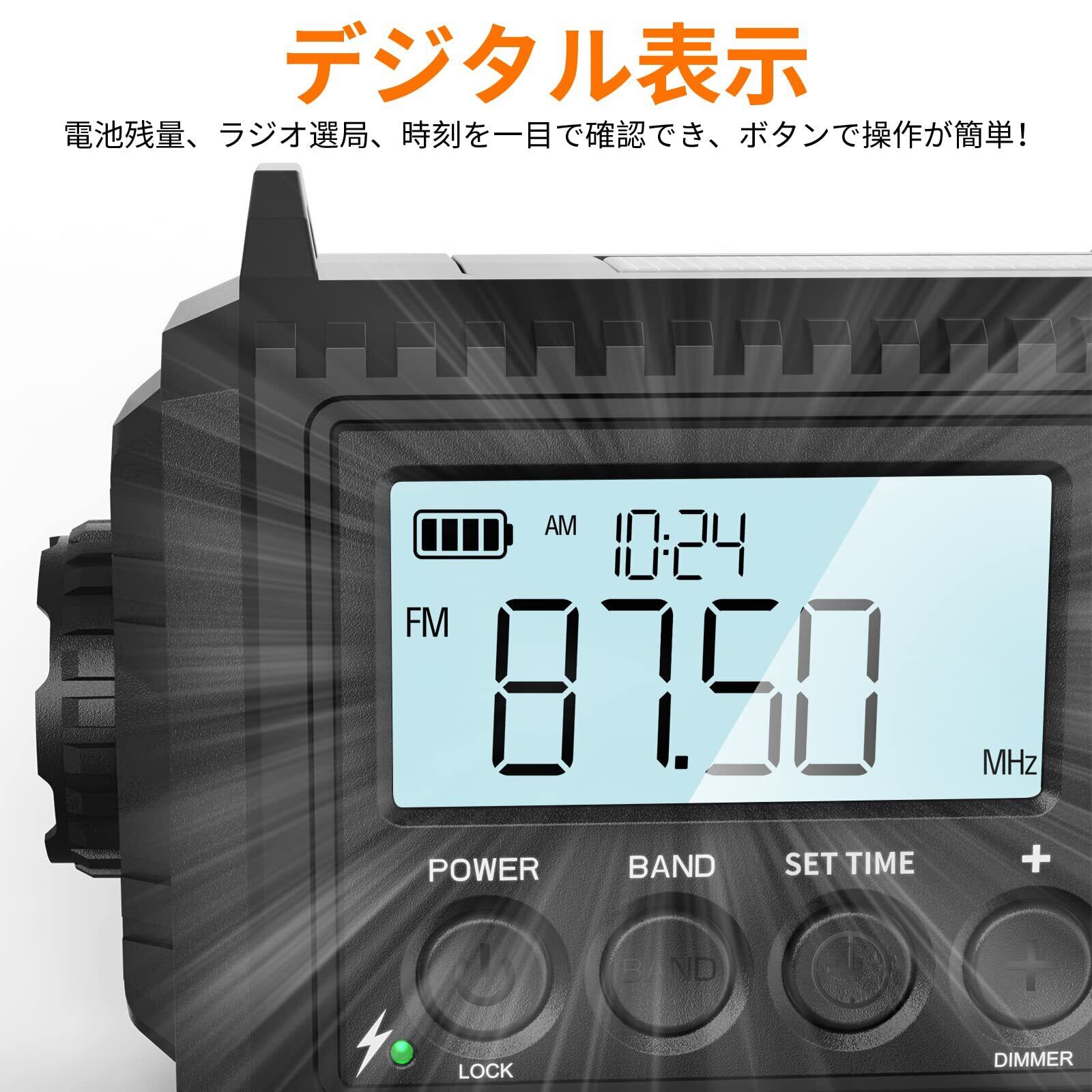 【大きなHD LCDディスプレイ 】 この天気ラジオには大きなHD LCDディスプレイ画面とデジタルチューニングがあります。バッテリー残量や現在のチューニング周波数を見ることができます。信頼性の高いAM/FM/SW/WB受信が可能で、お気に入りのチャンネルを正確に選ぶことができます。"Tune+"または"Tune-"を押すと、自動スキャンでお気に入りの番組を簡単に見つけることができます。"Dimmer"ボタンを長押しすると、バックライトLCD画面をオフにして省電力モードに入ります。