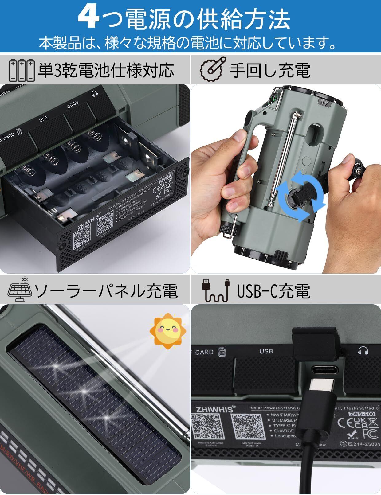 ZHIWHIS 防災ラジオ VHF/FM/AM/SW/ワイドFM対応 Bluetoothスピーカー/マイクロSD再生 APPコントロール/懐中電灯 手回し充電/ソーラー充電/USB-C充電式/乾電池で使用可能 4000mAh/つまみ/SOSアラーム付き 携帯小型 震災 台風 停電緊急対策 防災グッズ 新登場ZWS-908