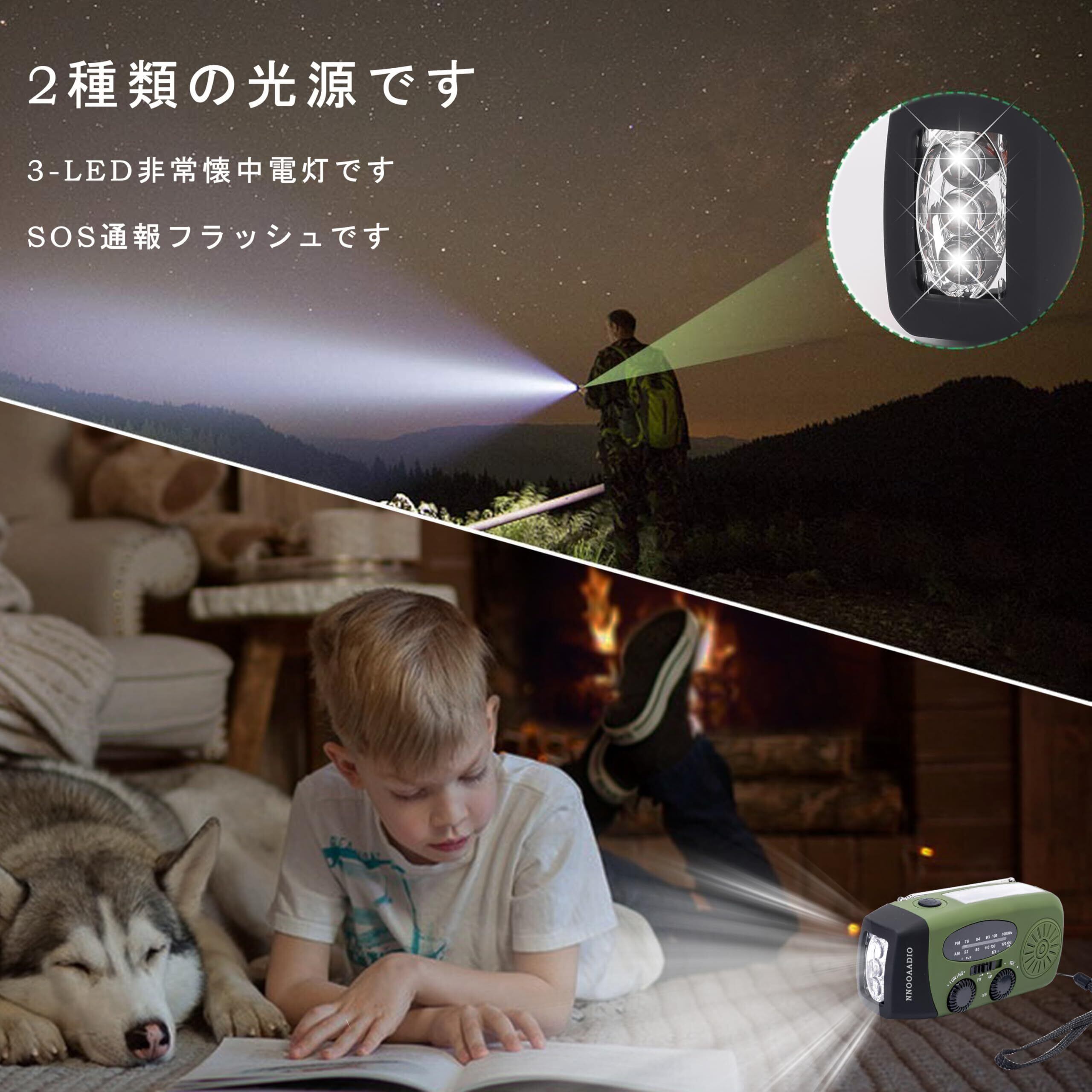 【照明とSOSと防水】このソーラーラジオは3つのLEDライトを共有しています。懐中電灯のスイッチを短く押すと、一段は弱い光、二段は強い光です。懐中電灯のスイッチを長押しします、SOS警報が鳴り,警報ハイビームがモス信号で点滅します。停電、戸外で家族と明るさをもたらすことができますと非常備蓄です。IPX 3-防水、この非常用照明器具は生活防水を満たしています。ラジオの飛散や小雨の被害から守ることができます。ただし、水に浸したり、雨に濡れたりしてはいけませんので、ご注意ください。