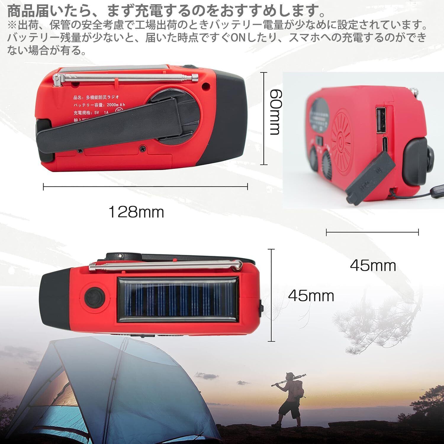 ・3つの充電方法 手回し充電手回しラジオ:製品の背面にあるハンドルを回すと充電可能。ソーラー充電ラジオライト:ソーラーパネルを日差しの方向に向けると、自動的に充電可能 USBケーブルで充電:付属しているUSBケーブルでUSBポートから充電可能