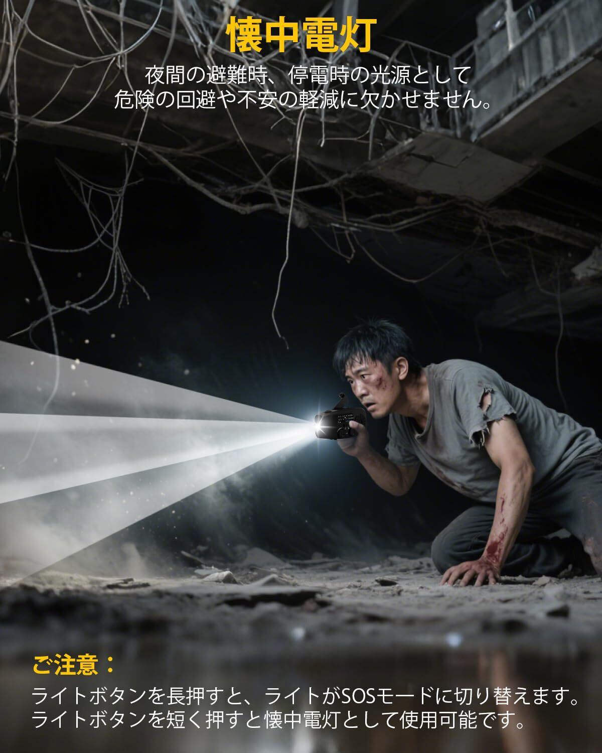 【多機能防災ラジオ&LEDライト&SOSサイレン機能】本防災ラジオは、日常から緊急時まで幅広く活躍する多機能モデルです。高輝度LED懐中電灯を搭載しており、停電時や夜間の避難時にも視界をしっかり確保できます。さらに、緊急時には大音量のSOSサイレンと点滅フラッシュで、周囲に自分の居場所や危険を知らせることが可能です。ライトの操作も簡単で、"ŏ"ボタンを短く押すと通常の照明モードに、長い押すと[SOS]フラッシュモードに切り替わります。ボタン長押しでサイレンが作動。災害時の備えとして、ぜひ一家に一台常備しておきたい安心のアイテムです。