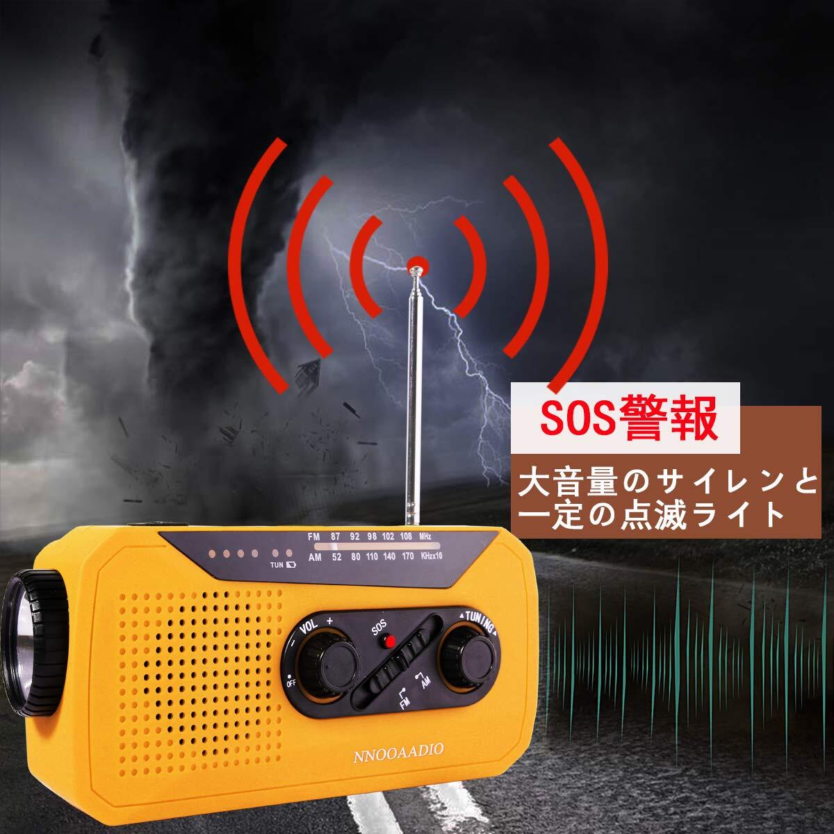 【安心・安全を与えてくれる防災ラジオ】防災多機能ラジオを事前に用意することで、安全かつ気軽に災害時を過ごすことができます。ラジオには、SOS、モバイルバッテリー、照明、手回し充電/ソーラー充電機能が搭載されています。危険に遭遇した場合、SOSボタンを押すと周囲に素早く助けを求めることができます。携帯電話の電源が切れた場合は、防災ラジオで携帯電話を充電することができ、Android、iphoneのすべての携帯電話に対応しています。暗い環境でラジオライトが使える懐中電灯。電力切れの心配がなく、手回し発電でラジオを急速充電できます。日差しがあれば太陽光に当てて充電することもできます。