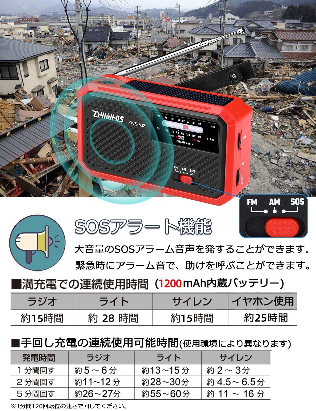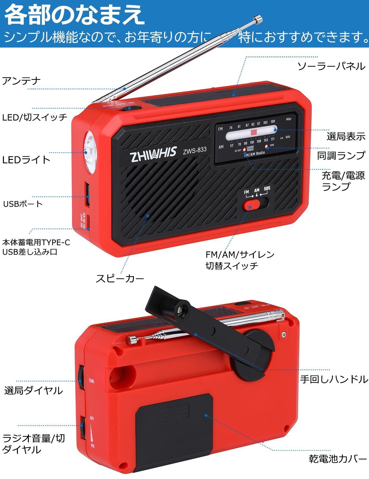 ZHIWHIS 防災ラジオ FM/AM/ワイドFM対応 懐中電灯 (手回し充電/ソーラー充電/USB-C充電/乾電池使用可能) 充電式電池式 携帯小型 震災 台風 停電緊急対策 新登場ZWS-833