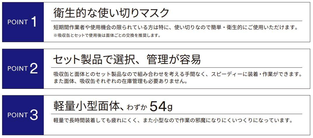●吸収缶と面体とのセット製品なので組み合わせを考える手間なく、スピーディーに装着・作業ができます。また面体、吸収缶それぞれの在庫管理も必要ありません