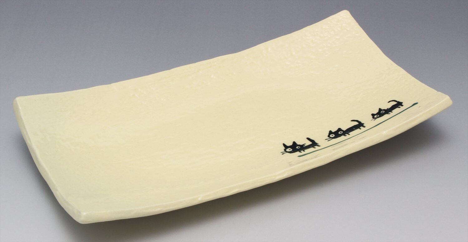 窯元SOUSEN 長皿 緑 23cm 瀬戸焼 長角皿 中 黒ネコ柄