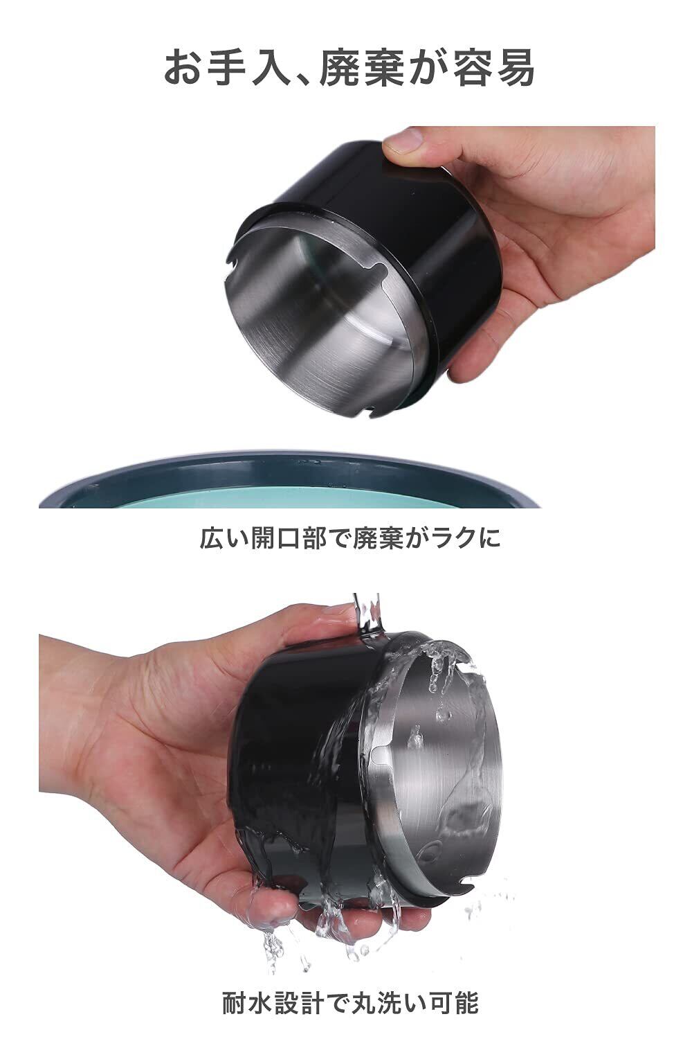 優れたパフォーマンスを:内側は堅牢で厚みと重量のあるステンレス製。熱や水に強く、他の素材や薄いステンレスに比べ長持ち。卓上でも屋外でも:防風&防雨設計なので卓上だけでなく庭やバルコニーなどの屋外使用にも最適です。機能的なデザインへのこだわり: 1.清潔感ある空間演出:吸い殻を隠し清潔感ある空間をキープできる形状。 2.防風設計:風の影響を受けにくいため、自然風、エアコン、人が通った時、書類の開封などで発生する風で灰が舞ってしまわない設計です。3.大容量:1日に何度も吸い殻を捨てに行く手間が省けます。 ヘビースモーカーの方にも最適です。3.重量があり円柱の形状で誤って倒れにくい構造です。