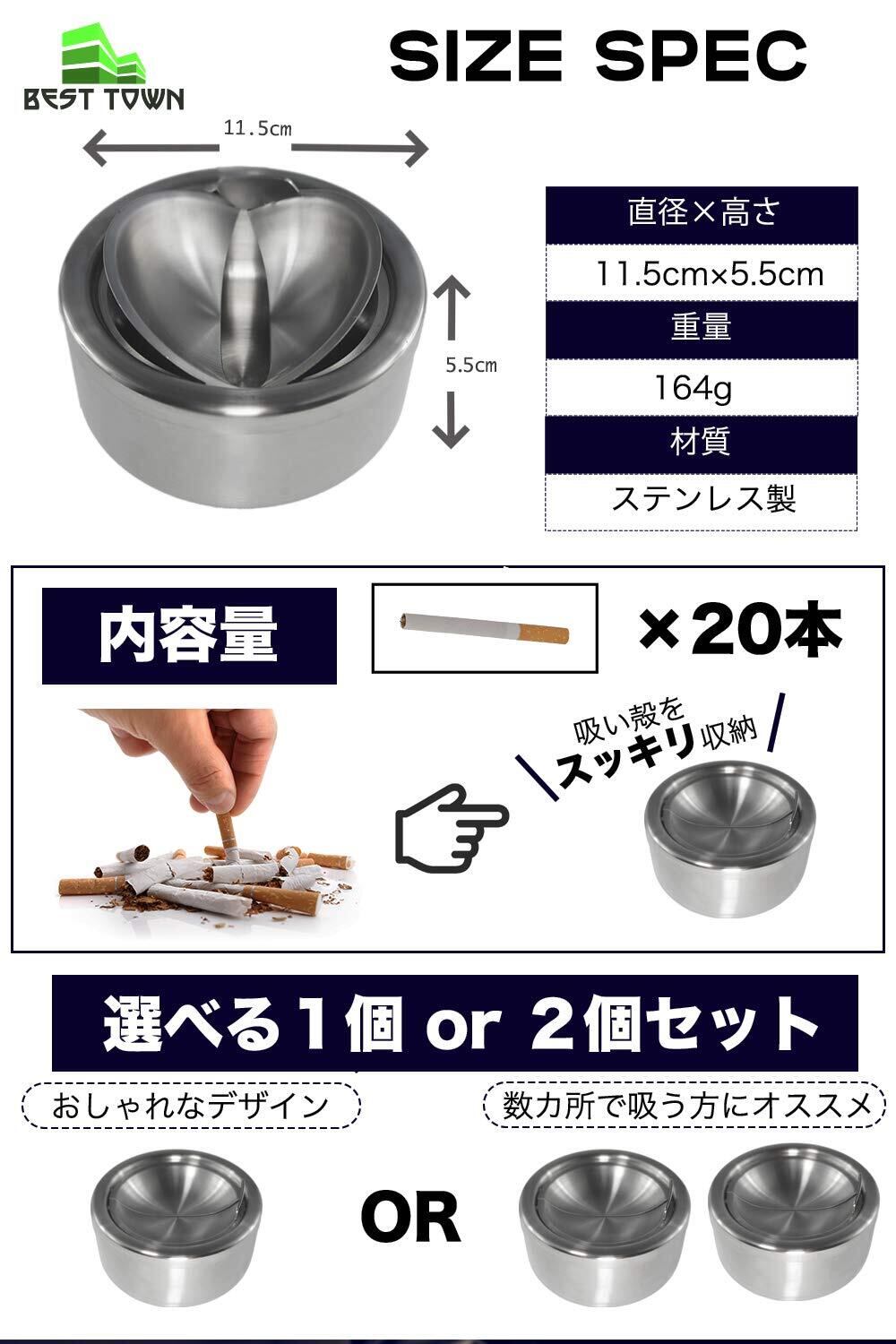 2【 ワンプッシュで観音開きのフタが開閉 】 「BEST TOWN」製の蓋付き灰皿は、押すと観音開き式のフタが開閉する仕組みになっており、吸い殻が飛び散ることなく下に収まり臭いも煙も閉じ込めることが可能なかっこいいデザインとなっております。喫煙者本人は気にならなくても、家族など周囲の人が煙やにおいを気にする方も多いです。蓋付きの灰皿の方が回りへの拝領にもなりおすすめのポイントです。また、灰の飛び散りや吸い殻が見えてうことも防ぐことが可能です。外観はシンプルモダンな仕様でお部屋の中に置いてもインテリアのアクセントにもなります。
