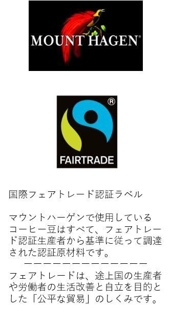 高地有機栽培のアラビカ種コーヒー豆100%ブレンドです。自然なカフェイン除去プロセスにより本来の深く豊かな味と香りをそのまま残しています。カフェイン残留率0.3%未満。欧米でを持つ天然の液体CO2と水だけでカフェインを除去する方法(いわゆる超臨界二酸化炭素抽出法)の採用により、本来の深く豊かな味と香りをそのまま残しています。新たにフェアトレード認証を取得。 MOUNT HAGEN(マウントハーゲン)のオーガニックコーヒーは、焙煎コーヒーもインスタントコーヒーも伝統的有機農法で栽培され、手摘みされた極上の高地栽培コーヒー豆のみを使用しています。 ゆっくりと丁寧なローストが、オリジナルの豆本来のバランスのとれた豊かな香りを生み出します。 最新の自然工法により、フリーズドライでありながら本格的な味わいを楽しめます。 有機農法の利用により、カフェイン抜きのインスタントコーヒーであっても本来の香りをそのまま残すことができ、深い味わいと体にやさしいという二重の喜びを提供します。 深く豊かな香りを持つ高地有機栽培の最高品質アラビカ種100%のブレンドです。 欧米でを持つ天然の液体二酸化炭素と水だけでカフェインを除去する方法(いわゆる超臨界二酸化炭素抽出法)の採用により、本来の深く豊かな味と香りをそのまま残しています。カフェイン残留率0.3%未満。
