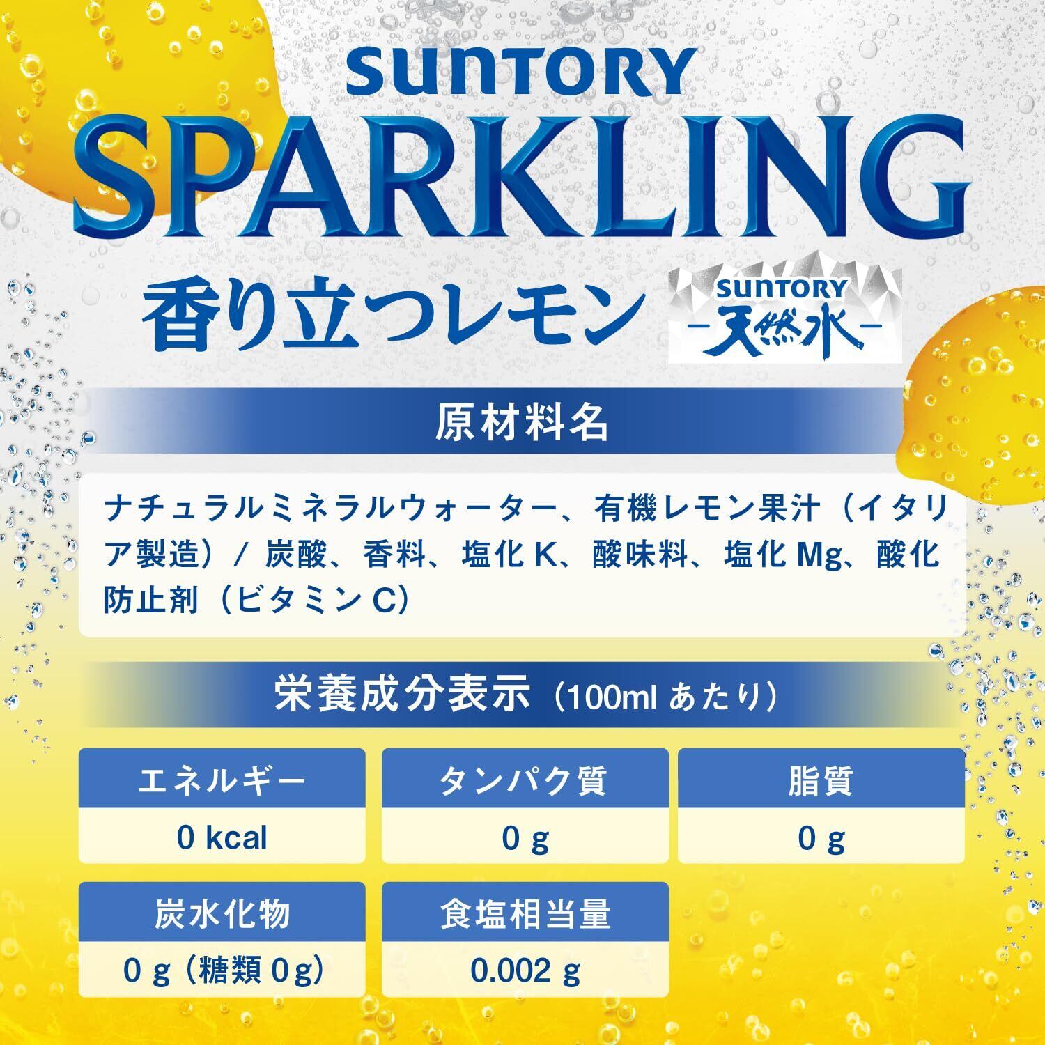 清冽なサントリー天然水と朝摘み有機レモンを使用。搾りたてのようなレモンのおいしさの、キリっと爽快な炭酸水サントリー天然水スパークリングレモンです。分別が便利なラベルレスボトルです。●清冽なサントリー天然水と、こだわりの果実シチリア産朝摘み有機レモンを使用●サントリーブランドで最も低温条件の「低温殺菌」によって、みずみずしいレモンの香りを高めることで、 「搾りたてレモンのようなおいしさ」をより感じられる中味を実現●飲用時のガス圧も高めに設定し、さらに流量の多い容器を組み合わせることで、キリッと爽快な強刺激を実現 (飲用時ガス圧約3.6kg/c㎡) ※ガス圧は流通条件により変わる可能性があります