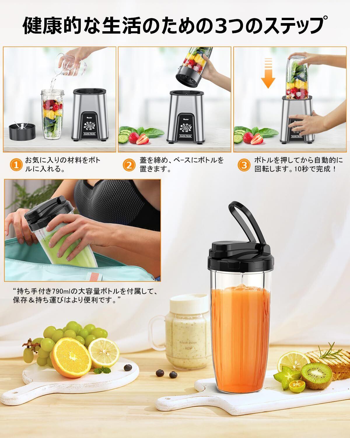 【安全装置&付き】スムージーミキサーは温度保護機能と底部の出風口のダブル保険で、過熱のリスクをカットされます。また、本体が正しくセットされないと運転しない安全機能付きます。土台に吸盤が付いているので、安定した状態で調理できます。パッケージ:モーターベース*1、790mLのジュースカップ*1、飲み口カップ*1、6枚刃カッター*1、日本語マニュアル*1、合わせて5点のセット付きます。キッチン/アウトドア/旅行/出張/ジム/オフィス様々な場所で楽に使えます。友達や家族へのプレゼント、誕生日、クリスマスギフトなどに最適です。ご購入日より24ヶ月のサポーターを提供します。万が一製品に品質問題がある場合、ご遠慮なくにご連絡いただきますようお願い申し上げます。期間内故障が発生しましたら、新品再送・全額返金と対応させていただきます。連絡ステップ:[アカウントサービス]-[注文履歴]-[出品者に連絡する]の方でご連絡ください。