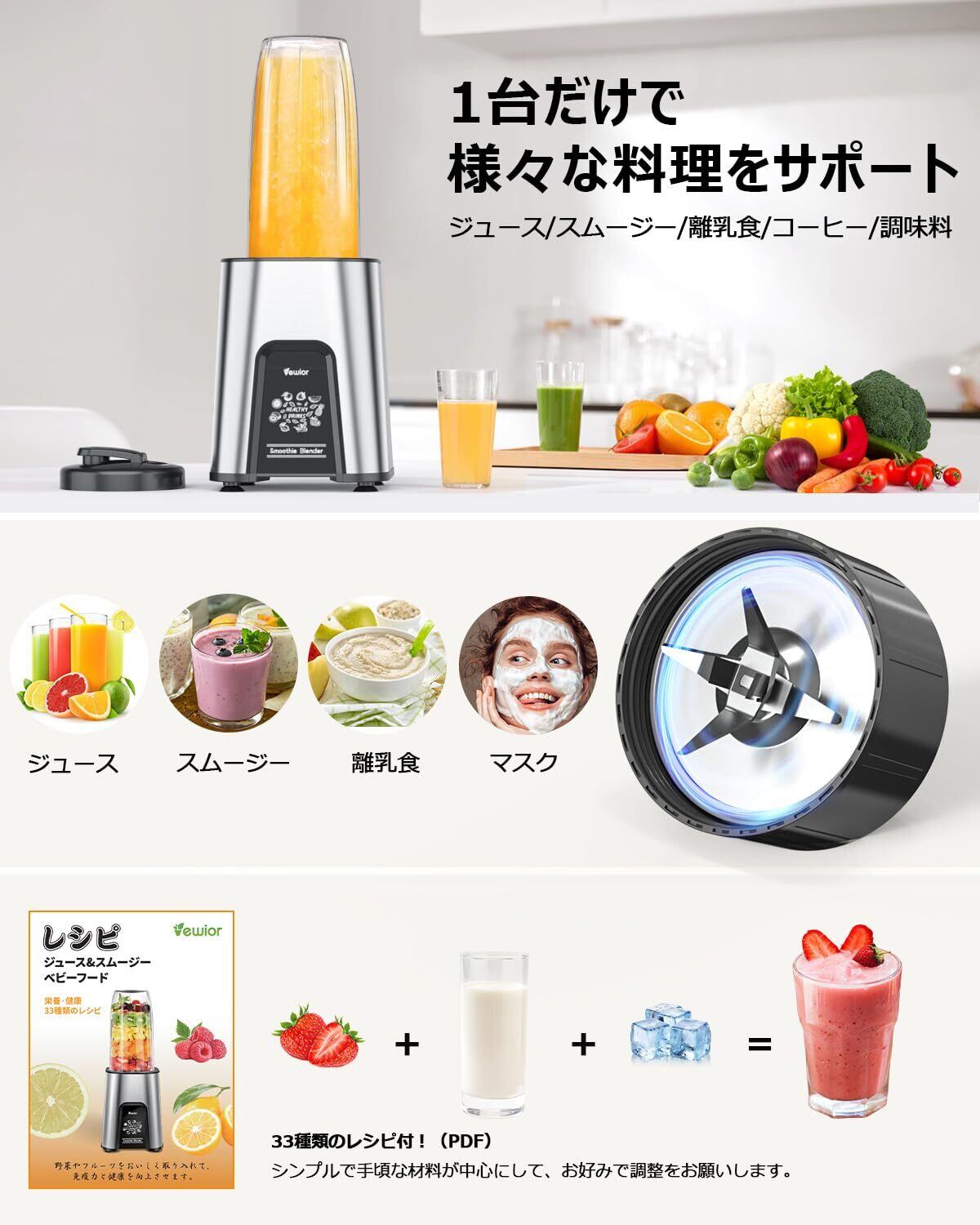 【2025最新版&1台多役&省エネのミキサー】VEWIORミキサーは2025最新版&業界初のスマートテクノロジーを搭載、つぶす ・混ぜる・氷も砕ける・こねるがこれ一台で調理できます。食品接触安全の304ステンレス鋼ブレードを採用しており、丈夫で耐久性が高いです。アップグレードされた6枚刃カッターを搭載し、野菜や果物の繊維質はしっかりとカットされ、なめらかな舌触りでゴクゴクと飲めます。氷も簡単に砕けてなめらか食感のスムージーがつくれます。毎分約2.5万回の高速運転で、野菜や果物はもちろん、氷や冷凍野菜・穀物やコーヒー豆もあっという間に細かく粉砕できます。