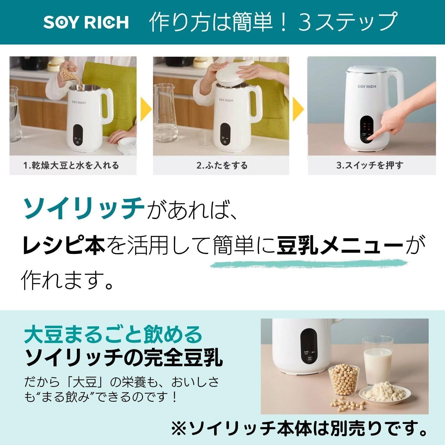 ソイリッチ 完全豆乳レシピ 60品目掲載されたソイリッチの活用レシピ 豆乳・スープ・発酵・ジュース・ミルクのモードをフル活用!SOY-AM02