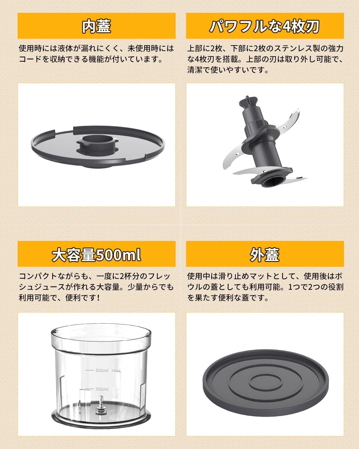 静音・スマートなコード収納機能:LINKChefのフードプロセッサーは、コンパクトなサイズ(24.3×13cm)で場所を取らず、収納に便利です。本体とボトルの間にコードをきちんと収納することができ、使わない時もスッキリと収納できます。さらに、静かな作業音で料理を楽しむことができます。最大500ml容量は、一人暮らしや小さな家族に最適です。使い勝手がよく、プレゼントにもおすすめです。