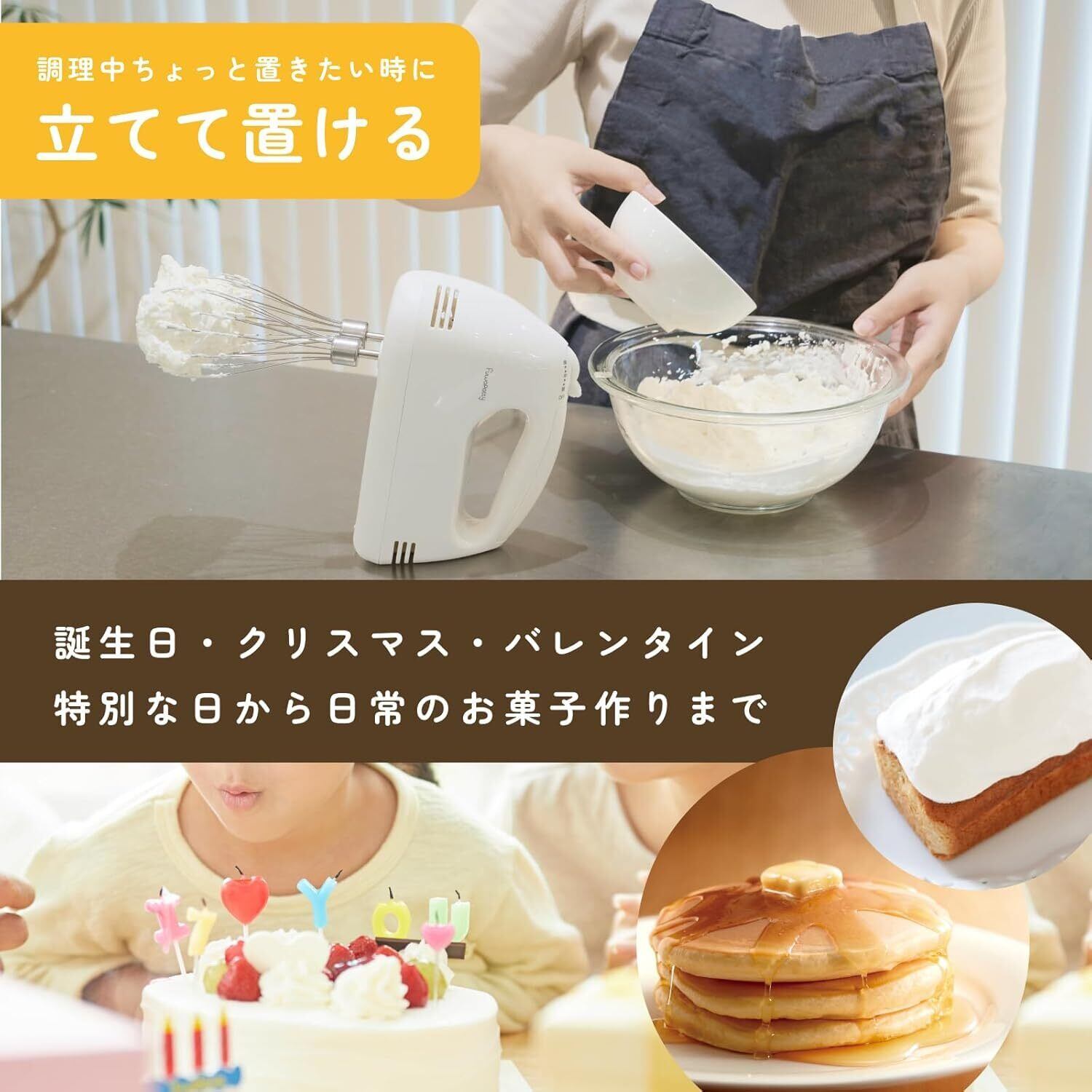 【超軽量タイプ】2つのビーターが付いていながら530gで軽い!腕が疲れにくいから片手で操作するのも楽々。誕生日、クリスマス、バレンタインなどの特別な日から、日頃のお菓子作りなどにも気軽にお使いいただけます。