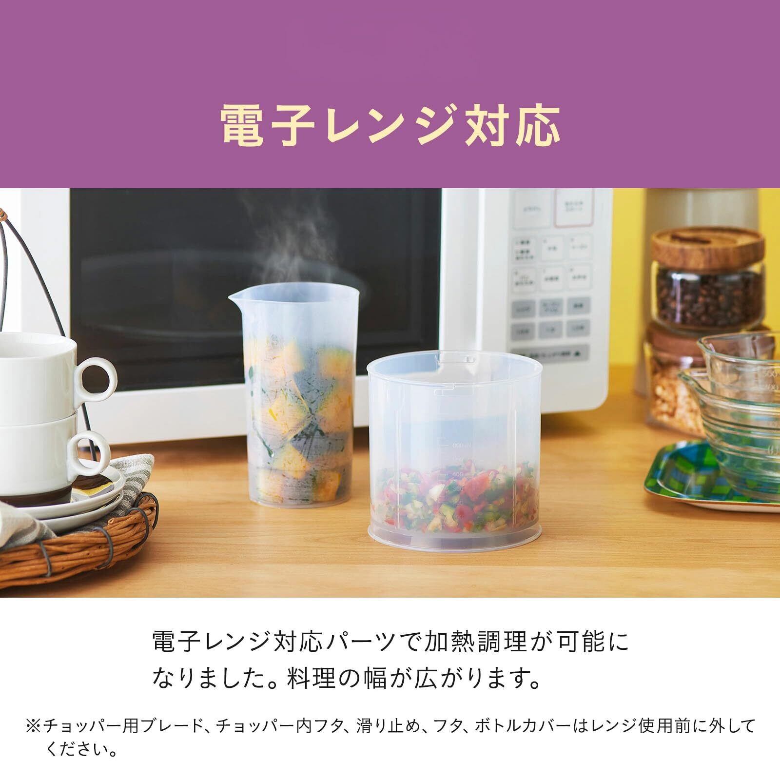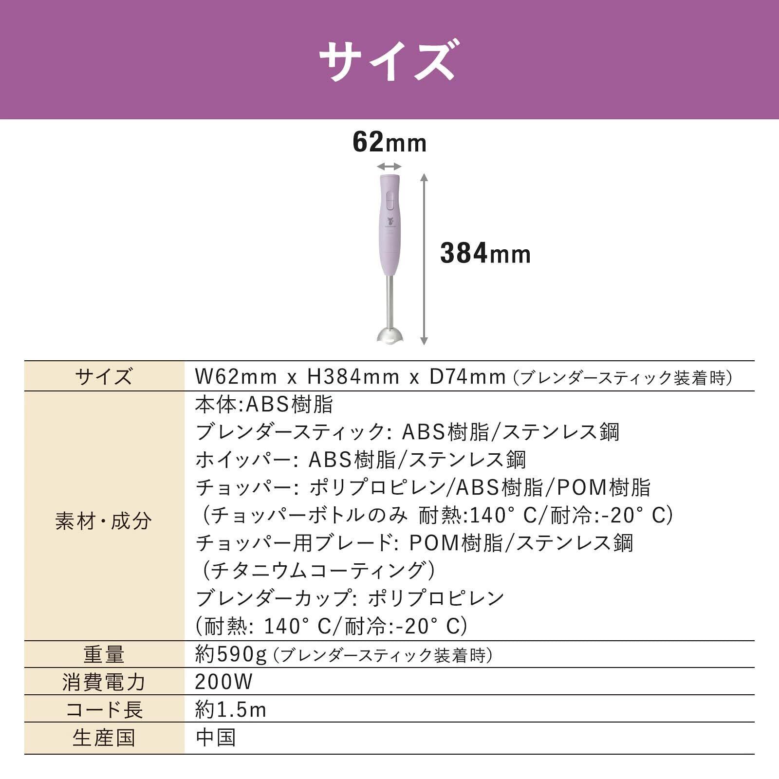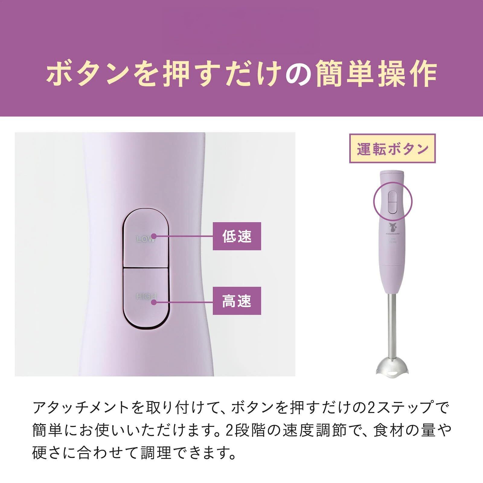 ブレンダー(つぶす・混ぜる)、チョッパー(刻む・砕く)、ホイッパー(泡立てる)、2段階速度調節