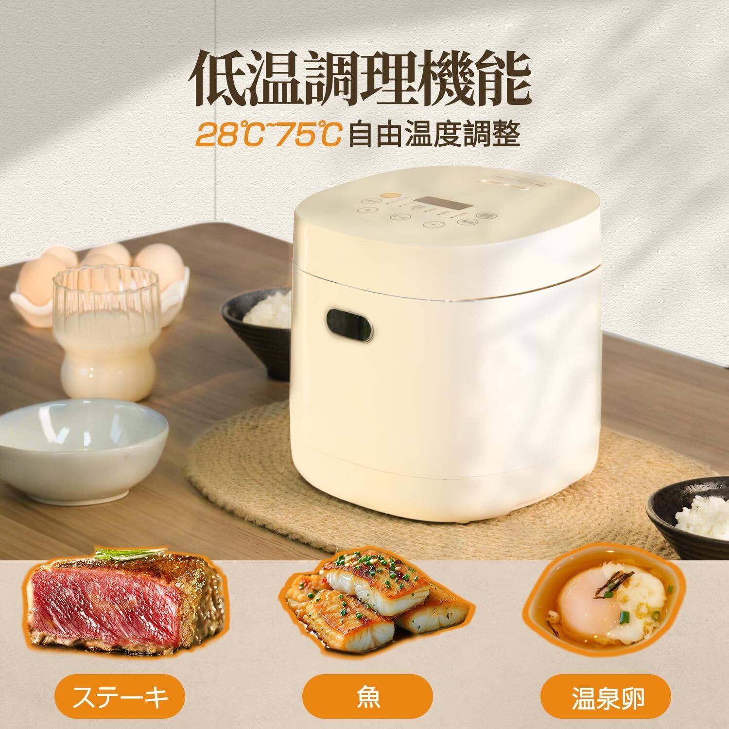 低温調理&温度調節機能付き:温泉卵やローストビーフなど本格的な低温調理が簡単に楽しめる炊飯器です。28℃から75℃まで2/5度単位で温度設定が可能で、時間も20分から12時間まで細かく調整できるため、幅広い料理に対応できます。独自の「低温調理モード」で炊飯器内の温度を安定的に保ち、タンパク質を壊さずヘルシーに仕上げます。材料を内なべに入れ、温度と時間を設定してスタートボタンを押すだけでOK。専用の低温調理器を購入せず、自宅で手軽にプロのような低温調理を体験できます。
