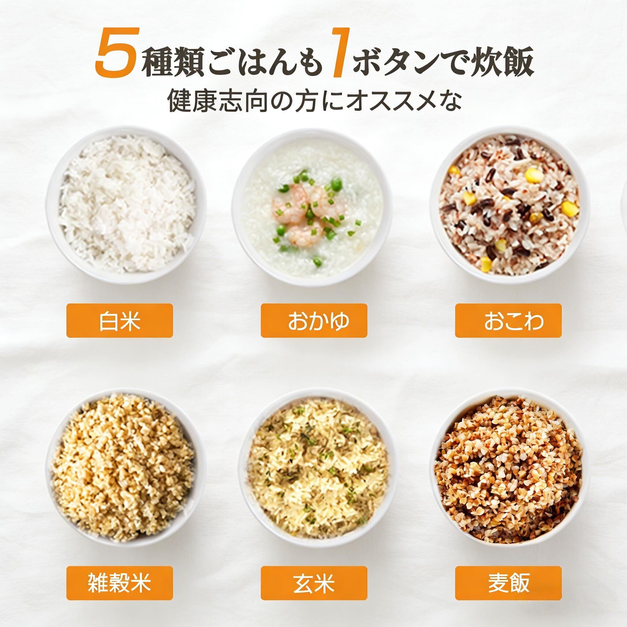 6種メニュー&予約/保温機能:この3合炊き 炊飯器 は「炊飯」「玄米」「早炊き」「低温料理」「ケーキ」「ヨーグルト」など、多彩な炊きコースを搭載しています。利便性:10分から12時間までの予約モードがあり、食事を柔軟にスケジュールできます。さらに、保温機能により、いつでも温かいご飯が楽しめます。予約を設定して、ご飯が自動的に炊き上がり、食事の時間まで温かさを保つので、忙しい家庭や食事の用意が必要な方に便利です!