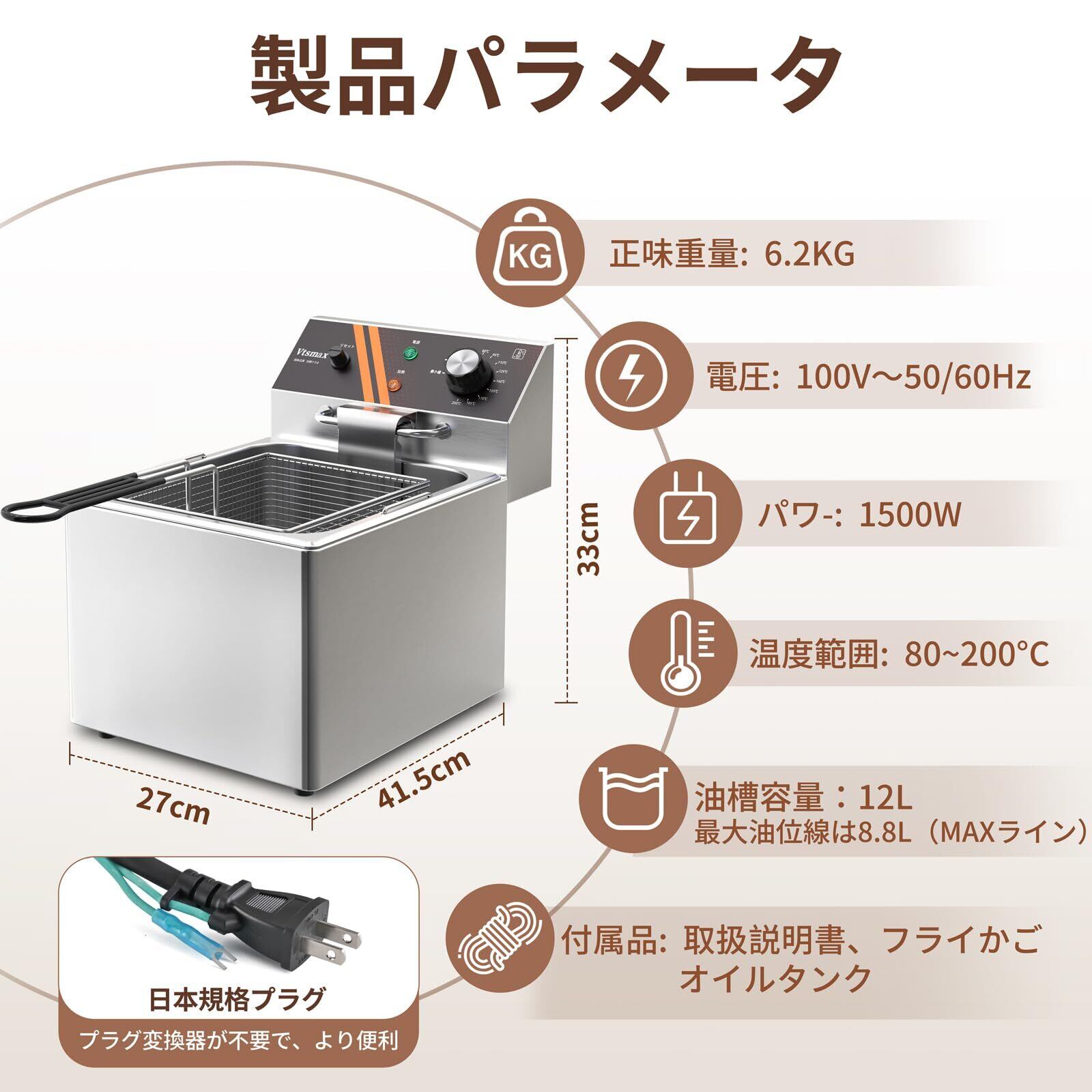 電気フライヤー 12L 業務用 家庭用 卓上フライヤー 1500W 100V 80〜200℃温度調節 304ステンレス製油槽 フライバスケット付き 串カツ・天ぷら・唐揚げなど揚げ物用