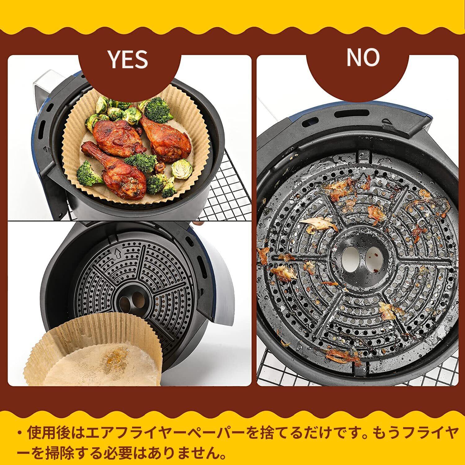 【使い捨て可能用紙】エアフライヤー用紙は高さが4.5cmあるので、エアフライヤーの側面を保護する同時に、食べ物の残留物や油を防ぎ、鍋を清潔に保ちます。