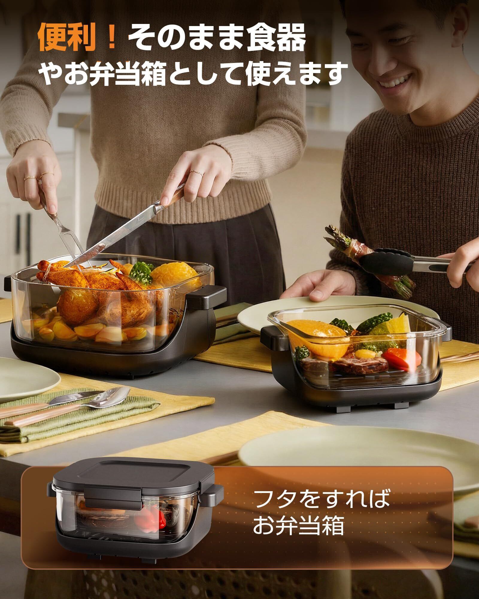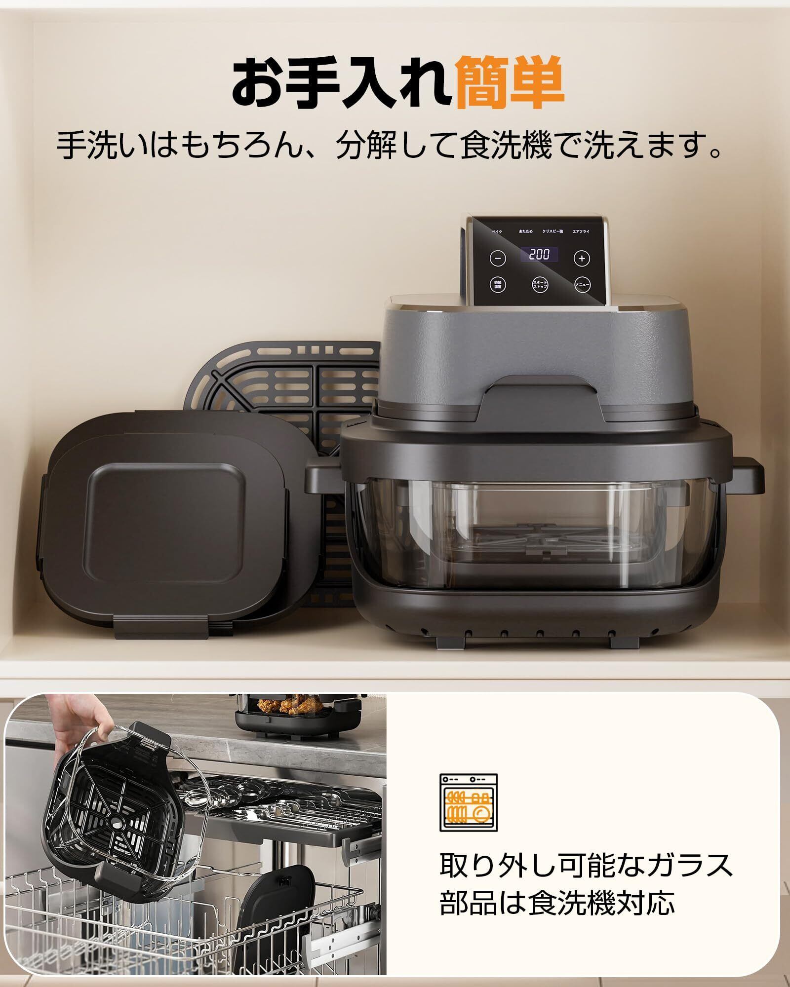 【透明ウィンドウでワクワク調理体験】 もう「いつ焼けた?」と悩む必要なし。透明ガラスで中が見えるから、調理の進行をリアルタイムでチェック!ノンスティックコーティング不使用で、健康的・長持ち・お手入れラクラク。最大230°Cの細やかな温度調整と自由なタイマー設定で、料理の幅がぐんと広がります。取り外し可能なガラス&トレーは食洗機対応で、洗い物も簡単!