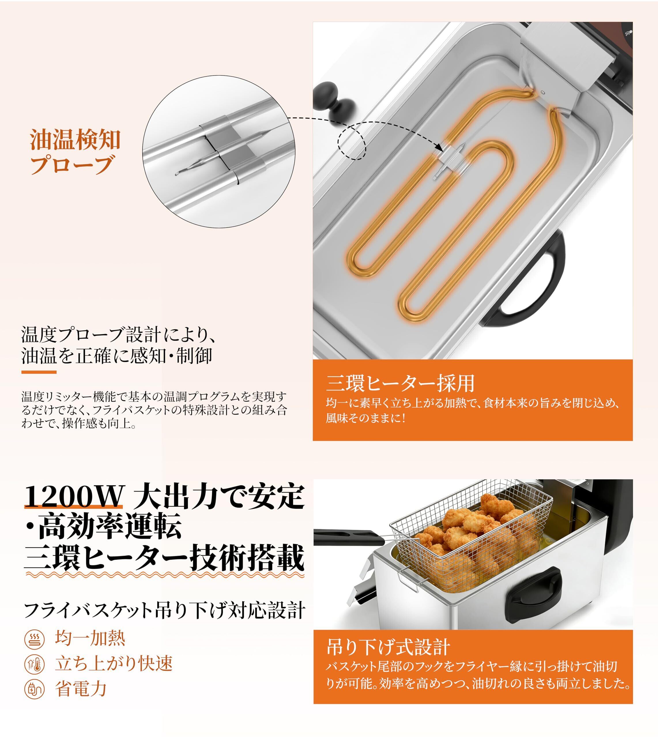 4L 電気フライヤー 4L 家庭用 業務用 卓上 タイマー付き 100V 1500W 5リング加熱管 急速予熱 60~200℃ 精密温度調節 自動保温 ステンレス油槽 ステンレス製フライバスケット付き フライドポテト/フライドチキン/各種天ぷら用
