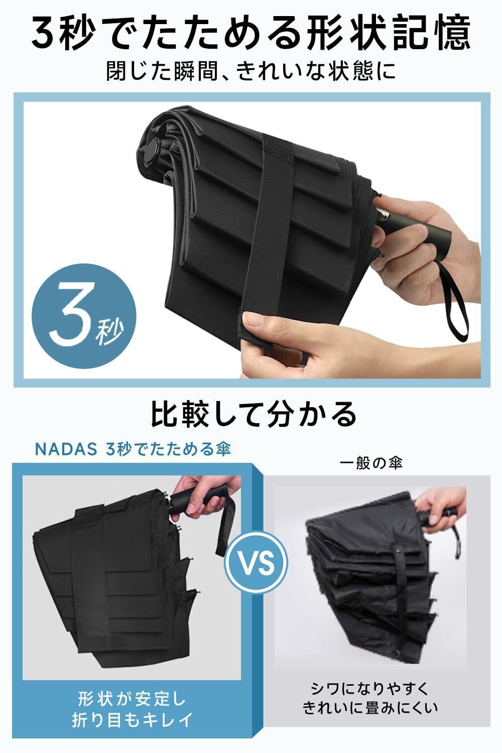 【形状記憶・3秒でたためる 折りたたみ傘】独自の形状記憶構造を採用した形状記憶 折りたたみ傘は、使用後に生地が自然に整い、誰でも簡単に折り目を揃えられます。広がりやすい従来の折り畳み傘と違い、たたむ動作が非常にスムーズで、忙しい外出先でも3秒でたためる傘としてストレスなく収納可能。通勤・通学・出張時にも扱いやすい高機能な折りたたみ傘です。