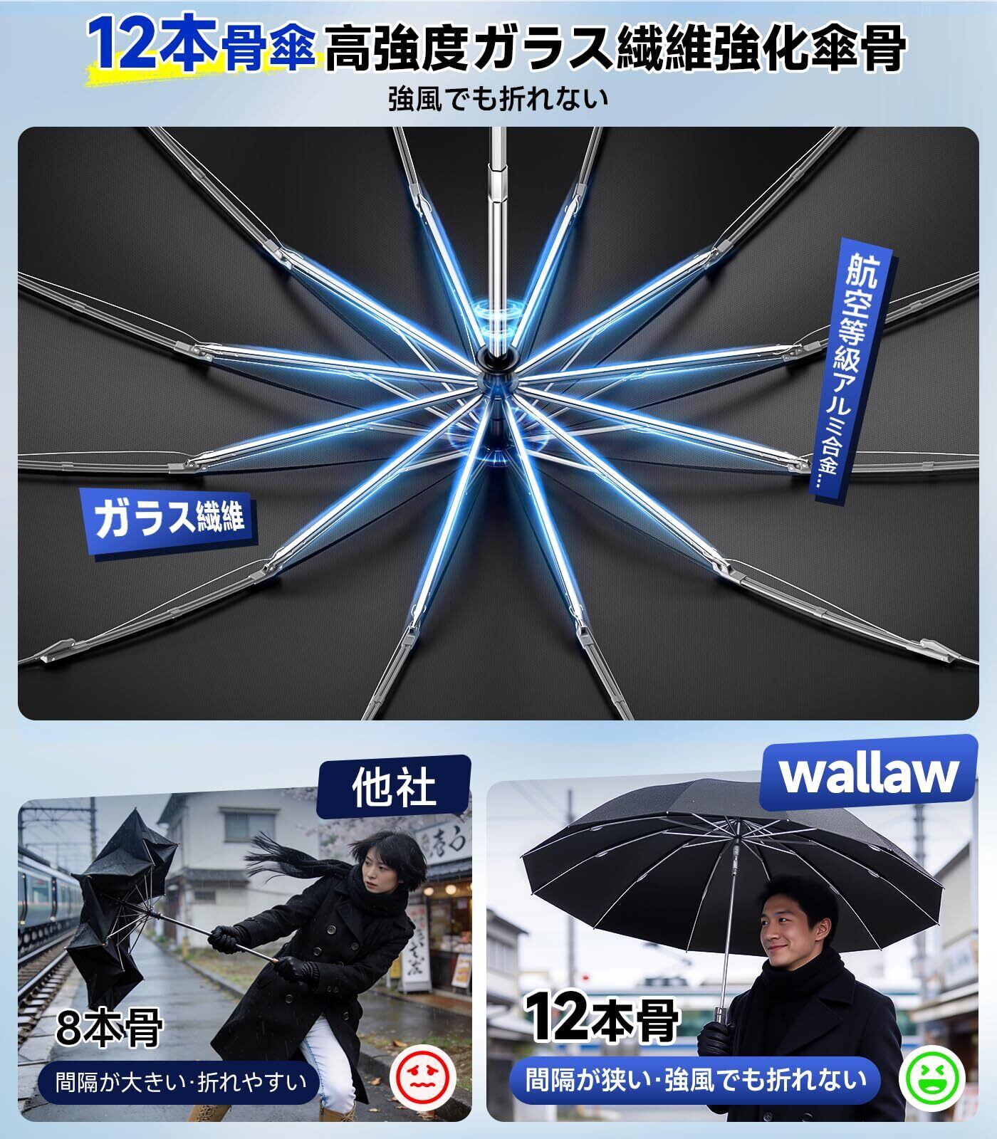【12 本強化傘骨&超撥水】Wallaw 超撥水・折り畳み晴雨兼用傘は、強靭な 12 本骨を採用し、柔軟性と強度を兼ね備えています。強風に対する耐性と耐久性が向上し、航空機用アルミ合金と高強度グラスファイバーで補強された傘骨のため、激しい雨や強風にも耐え、折れたり曲がったりしにくい設計です。錆びにくく壊れにくい構造で、日常使いでも安心してお使いいただけます。 傘布には高密度ポリエステル素材を採用し、表面にナノ超撥水コーティングを施しているため、豪雨でも体が濡れる心配がありません。雨が傘布に触れた瞬間、水滴となって弾き落とされ、優れた撥水性能を実現しています。