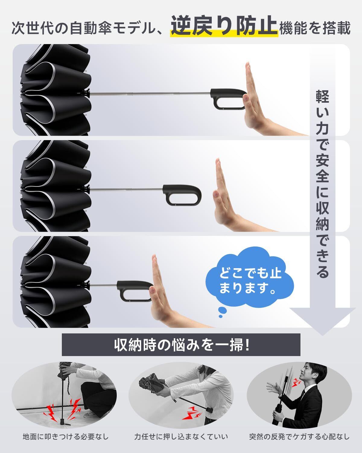 【0.5秒で瞬速展開!飛び出し防止の安全設計】ボタン1つで、まるで精密機械のように0.5秒で自動開閉。車の乗り降り時や、両手が荷物で塞がっている時、さらにお子様を抱いている場面でも、片手操作でスムーズに使用できます。収納時に中棒が途中で止まる「飛び出し防止機能」を搭載しました。押し戻される反動によるケガや誤作動をしっかり防止し、力に自信のない女性やご高齢の方、お子様でも安心して扱える安全構造です。