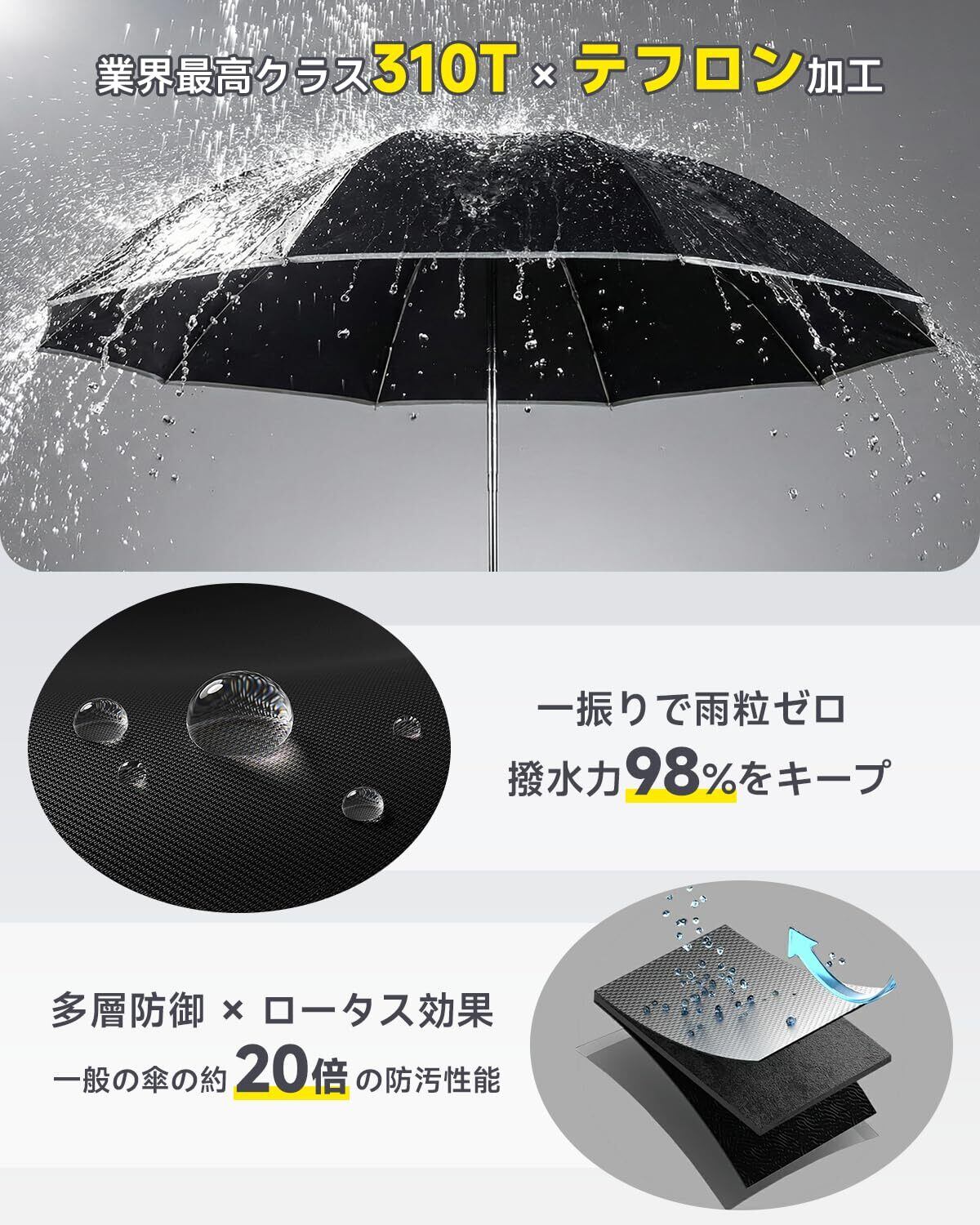 【一振りで速乾!抜群の310T撥水性】傘布の概念を変える、驚異の310T高密度素材を投入。生地表面には、世界トップクラスの撥水技術であるテフロン加工を贅沢に施しました。使用後はわずか一振りで、表面に残った微細な水滴すら弾き飛ばします。
