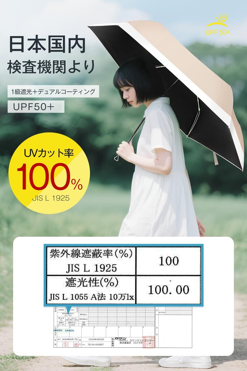 【UVカット 完全遮光傘】JIS規格に基づく厳格なテストをクリアした完全遮光&100%UVカットを実現。高密度生地に多層遮光コーティングにより、強い日差しを遮り、紫外線を100%ブロック、光透過率0、UPF50+の日傘で、大切なお肌を守ります。熱線となる太陽光線をカットするため、ジリジリ日差しの中を歩いても、日陰ができたみたいに涼しく保ち、炎天下でも紫外線を恐れません。真夏を乗り切る日焼け対策・暑さ対策グッズに最適。