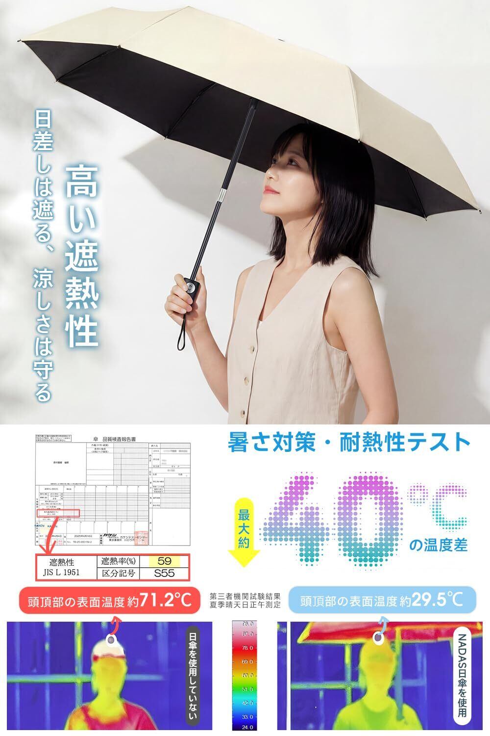 【JIS認証 UVカット率100%・完全遮光・遮熱】高密度生地によりUVカット率100%・UPF50+・完全遮光を実現した高性能日傘。強い日差しや紫外線をしっかり遮る折りたたみ日傘で、夏の日焼け防止・紫外線対策・熱中症対策に役立ちます。遮熱効果により体感温度の上昇を抑え、暑い日でも快適に使える折り畳み 傘・日傘です。