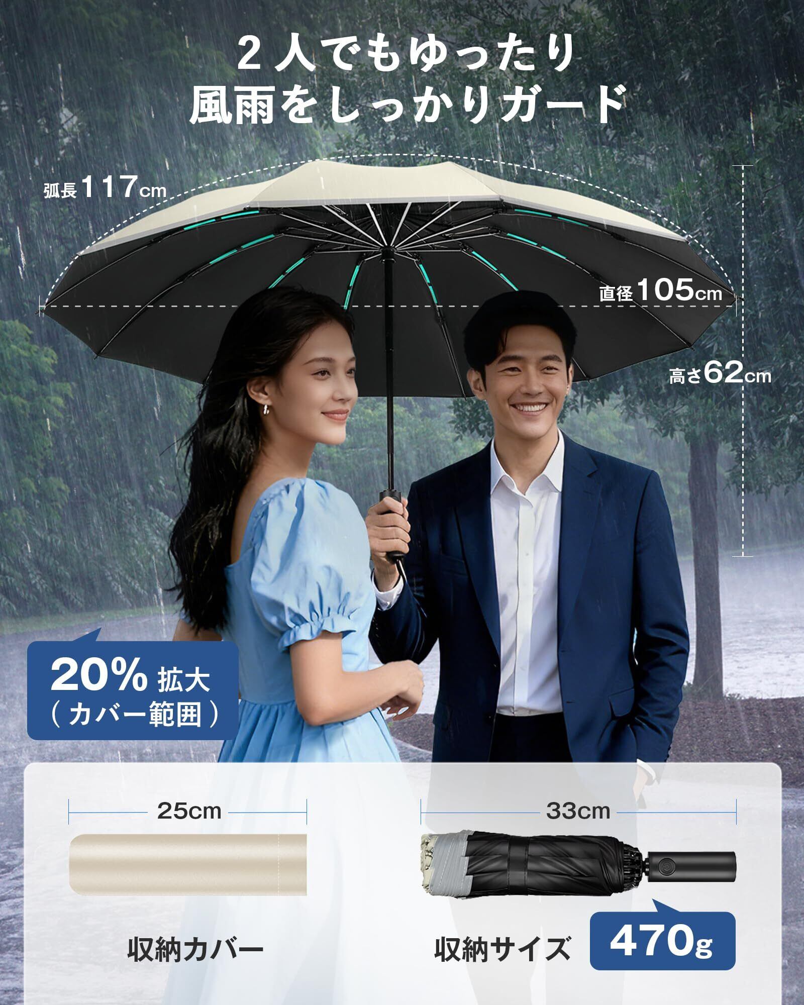 【117cmの大型サイズ&2人でも対応】折りたたみ傘はカバー範囲を拡大し、開いた後の直径は105cm、傘面の弧長は117cmで、大人2人でも余裕で使えます。防水範囲が広いため、リュックを背負っても濡れる心配がありません。折りたたみ傘の収納時の長さは33cmで、収納袋も付いているので、リュックや車内に常備しておくと、突然の大雨でも安心です。
