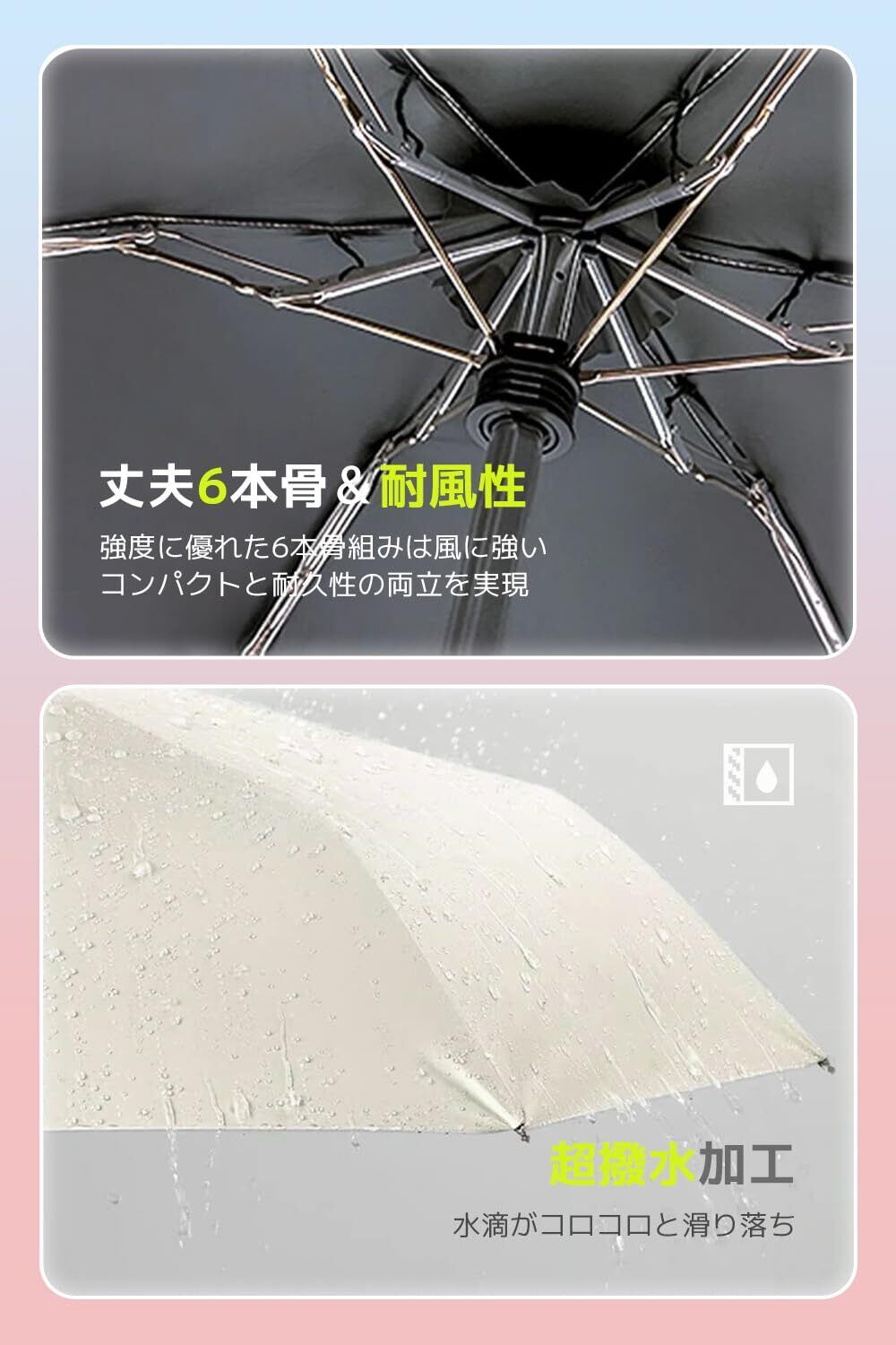 【2in1晴雨兼用傘】季節を問わず使える全天候対応の日傘兼用雨傘です。210T高密度の撥水加工材料で作られ、雨が珠のように丸くなり転がり落ちます。普通の傘より撥水性が優れ、軽く振るだけで雨水を振り払えます。