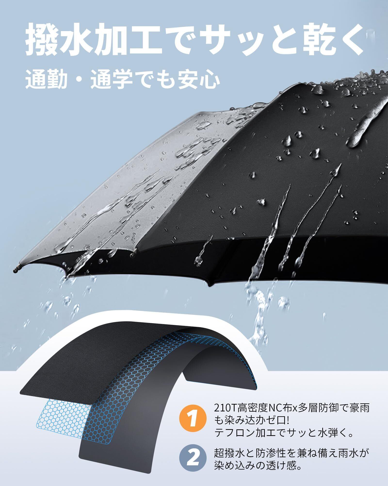 8本の傘骨+ガラス繊維構造で、強風の中でも安定。柔軟かつ強靭なガラス繊維製メイン骨8本を採用。錆びにくく、強風でも折れにくい設計。万が一傘面が裏返っても、ボタンを押すだけで簡単に復元。耐折設計により長寿命を実現。