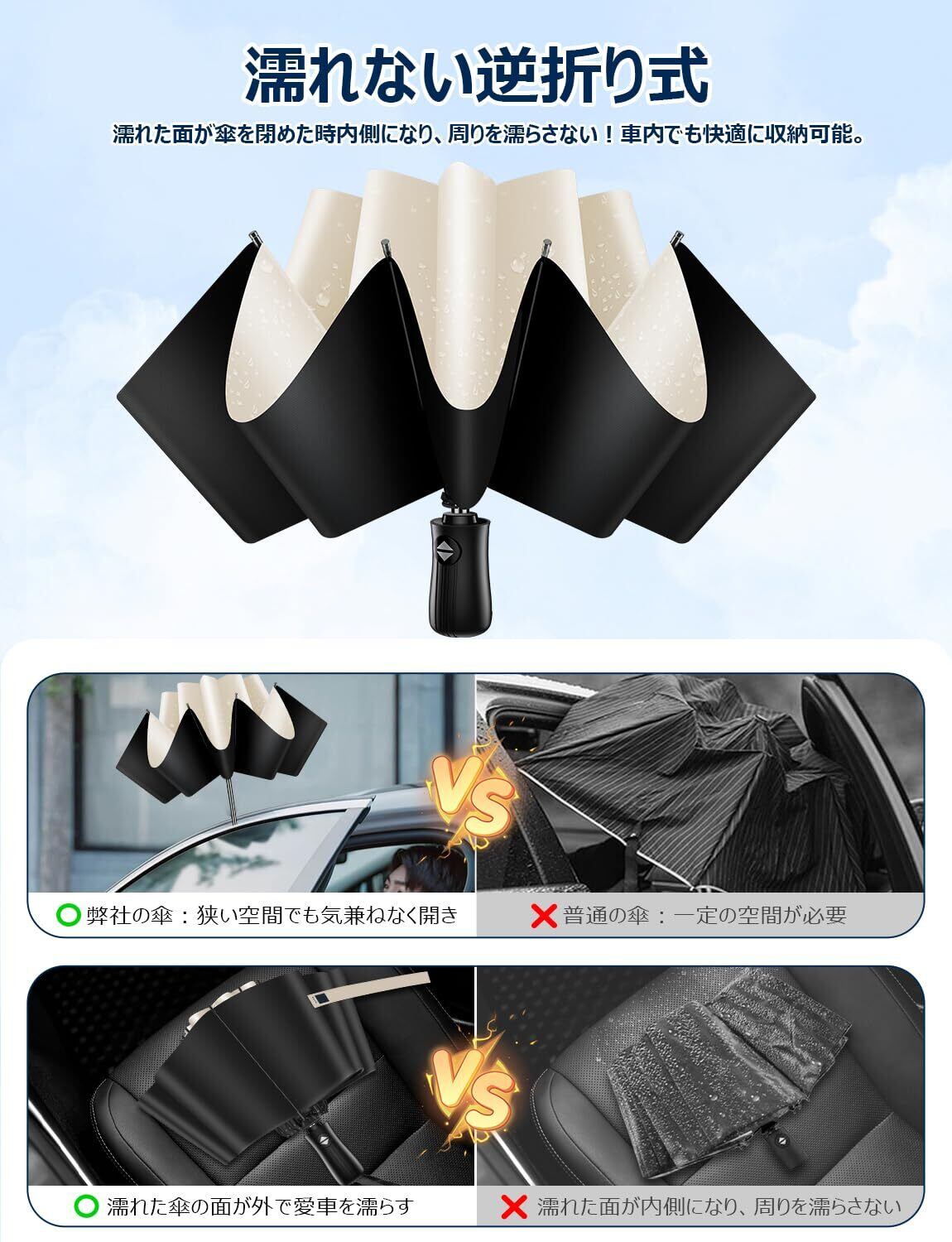 【逆戻り防止安全設計傘】✿一般的な自動開閉式折りたたみ傘はシャフトを縮める際、一気に押し込まなければバネが逆戻りして危険です。の自動開閉傘は自動開閉機能に不意な飛び出しを防ぐセーフティシャフト搭載で、一般的な自動開閉折りたたみ傘より安全に閉じられます。逆戻りしない安全式自動開閉傘は途中で手を放しても飛び出さずに、どこでも止まります!︎不意な飛び出しを防止し、段階的に収納可能なので、顔や体に衝突するおそれがなくなり、安全性が大幅に向上した折りたたみ傘です。地面や壁に当てなくても、両腕の力だけでも仕舞えるので、男性はもちろん、女性やご年配の方でも安全・簡単に操作できます。