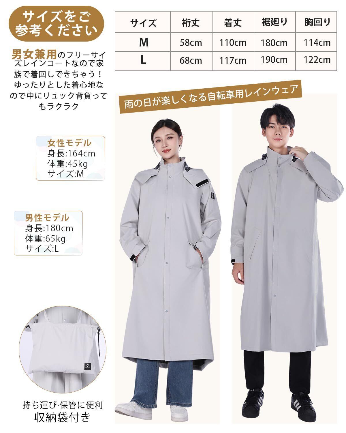 HINOKAZEの新作、晴れの日も雨の日も、あなたのスタイルを格上げする一着:1.高品質ポンジーを採用し、通気性に優れてムレにくく快適な着心地を実現。メッシュライナー付きで汗をかいてもベタつかず爽やか。TPUコーティングで防風・防水性もアップし、雨の日も快適なライディングをサポート。2.手の甲をしっかり守るカバー付きで濡れを防ぎ、自転車走行中も安心。3.着脱可能なフードと透明バイザーで顔をしっかりガードし、リュック対応デザインでアウトドアや通勤・通学にも最適なスタイリッシュレインコートです。
