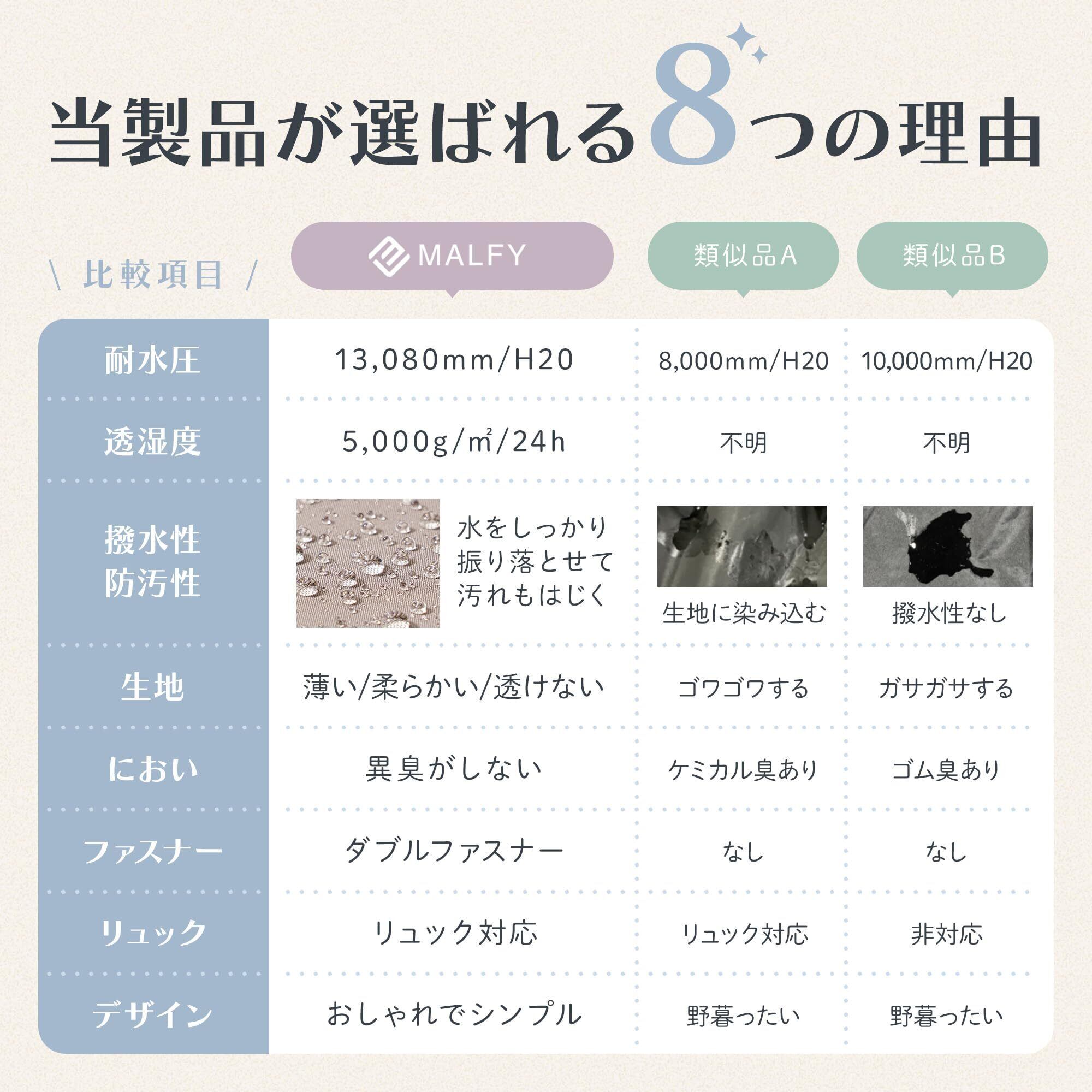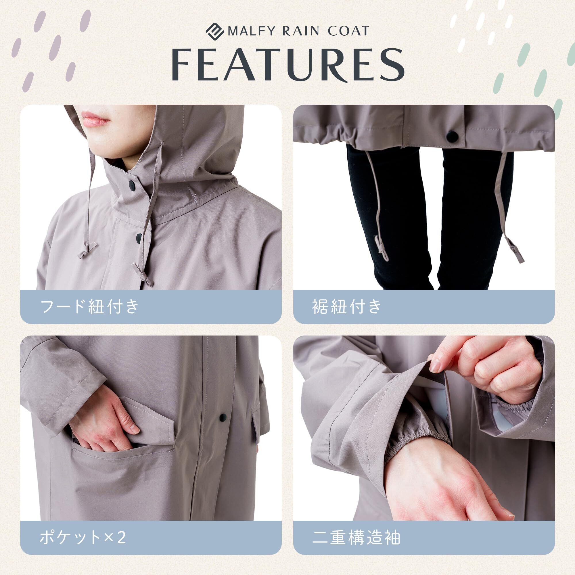 【抜群の撥水性】生地の表面が微起毛になっているため、雨が降っても蓮の葉のように一瞬で水滴を弾くレインコートロング丈です。雨量の多い日のお出かけはもちろん、ゲリラ豪雨にも対応しています。