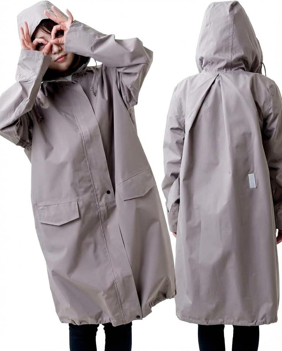 【シンプルでおしゃれなデザイン】思わず雨の日以外にも使いたくなるような、シンプルで上質なデザインのレインコートに仕上げました。フード紐、裾紐、二重構造袖、ロング丈でしっかりと雨水の侵入を防ぎます。
