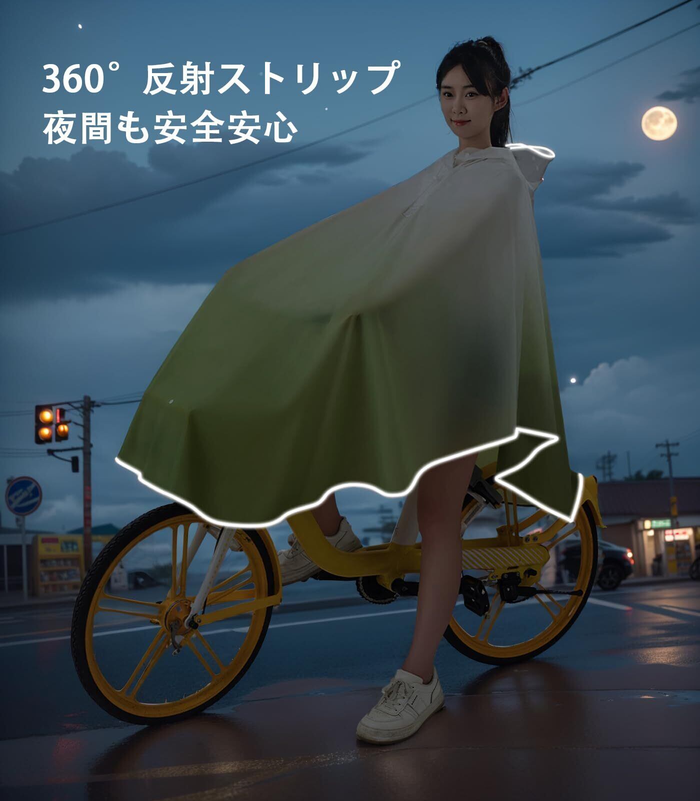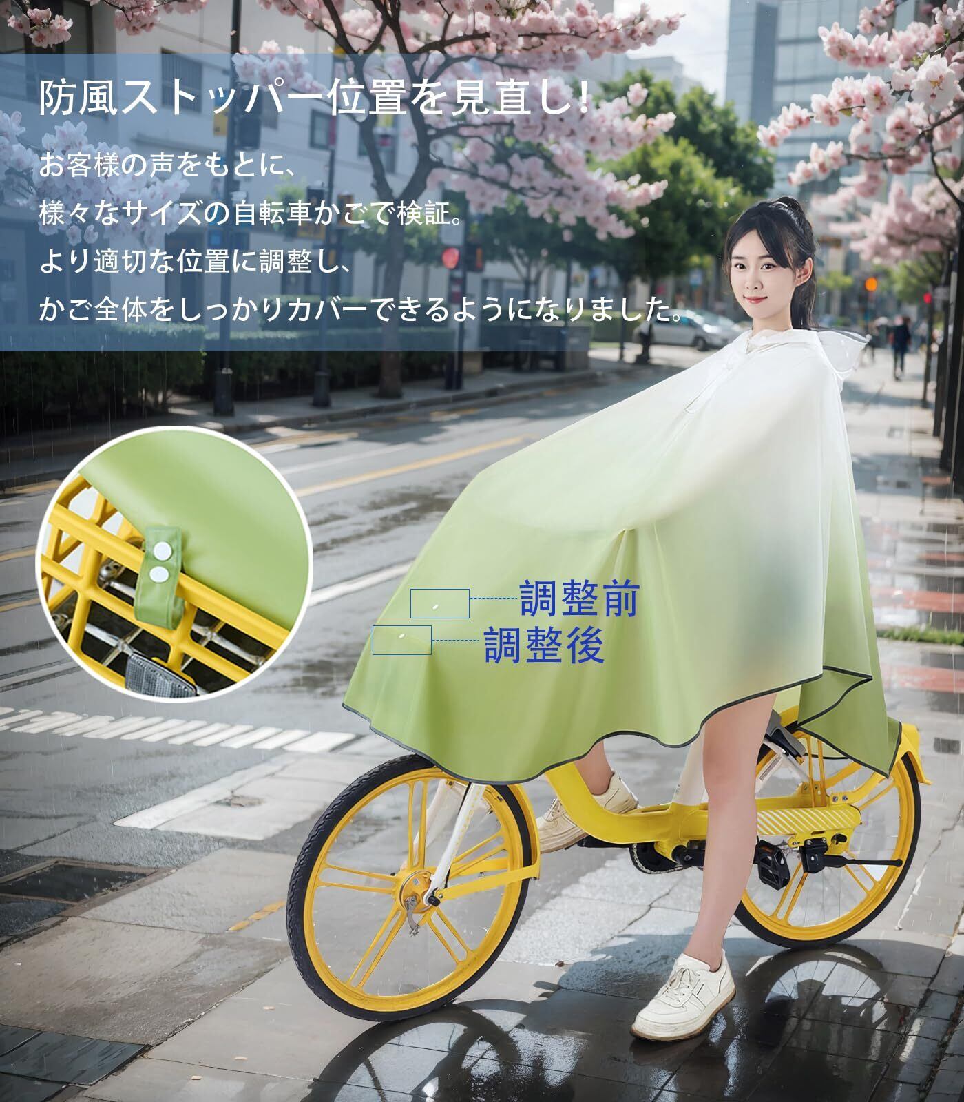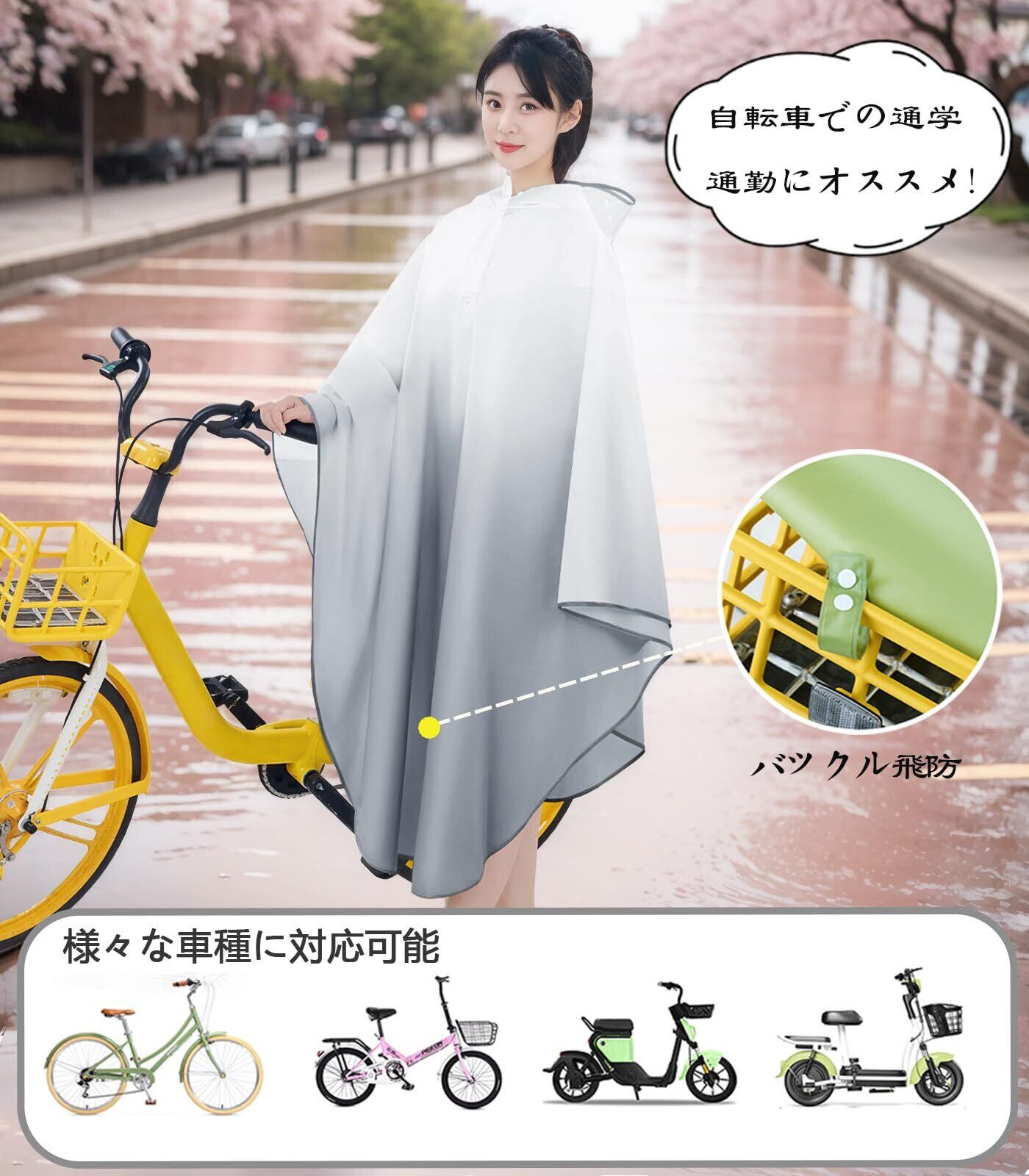 【おしゃれな防護、安全な自転車ライフ】トレンディなグラデーションカラーのレインコートで、雨の日でもお洒落を楽しめます。このレインポンチョ型レインコートは、延長されたスカート部分が自転車のかごを巧みに守り、濡れる心配もありません。高品質EVA素材を採用し、無臭で肌触りも柔らかく、防水・速乾性に優れた雨具です。さっと拭くだけでお手入れ簡単。革新的な調整可能な風よけバックル設計で、強風時でも前裾がめくれ上がる心配なく、安全な自転車走行をサポートします。蒸れない設計で、快適な着用感を実現したかっぱです。