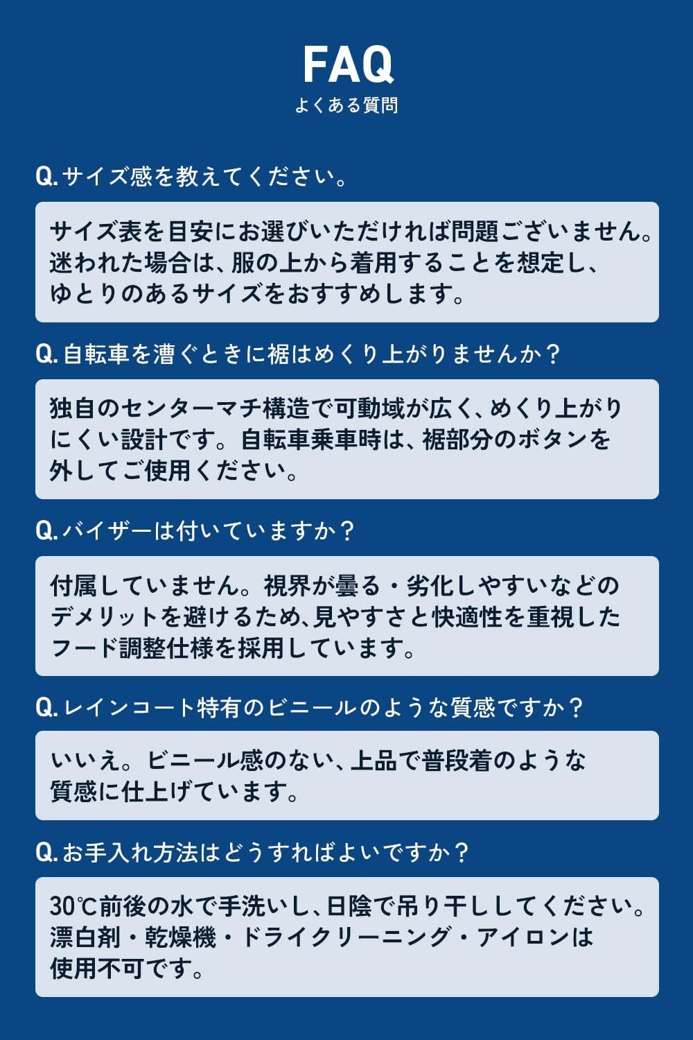 【自転車・バイク対応設計】独自のセンターマチ構造により、ペダルを漕いでも足元が濡れにくい。リュックを背負ったまま対応できる大きいサイズ感も魅力。ポンチョやレインポンチョではカバーできない“前傾姿勢の濡れ”を解決します。自転車通勤や送り迎えをするママにも最適な雨衣です。