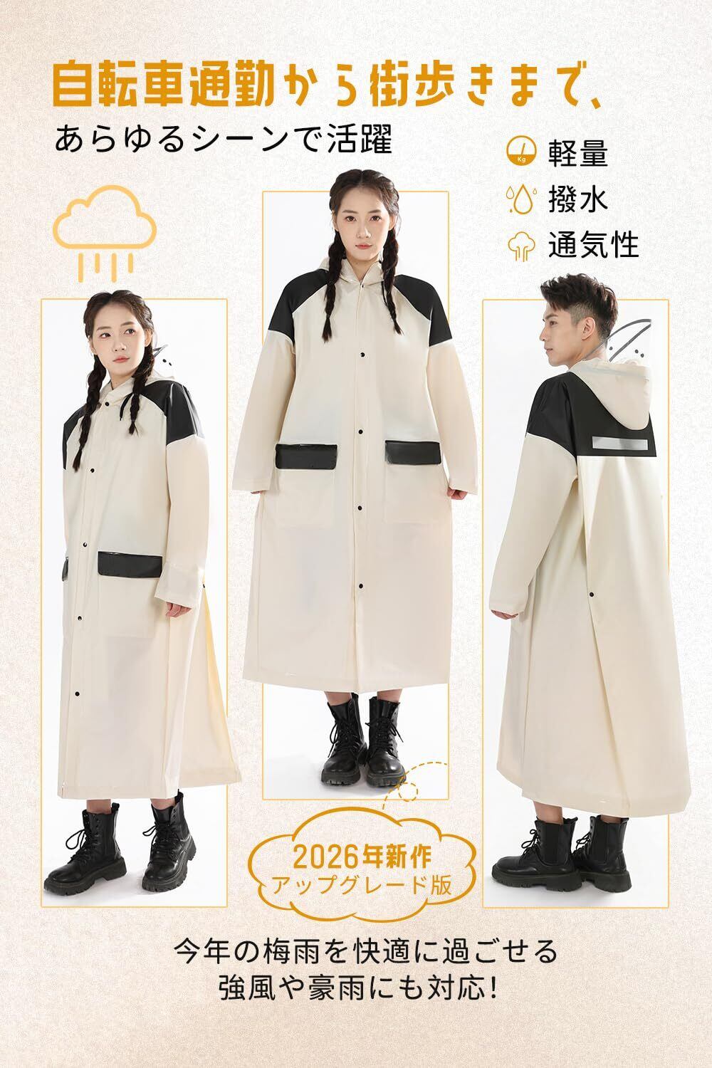 【ユニセックス/ロング丈デザイン】 中学生から大人まで幅広く対応。男女兼用のツートンカラーでスタイリッシュなデザイン。レインコート レディースにもレインコート メンズにもおすすめです。サイズ感は個人差がありますので、必ずサイズ表をご確認の上ご注文ください。通勤・通学時の雨天、自転車/バイク利用時、雨中の作業に最適。台風や梅雨対策にも有効です。