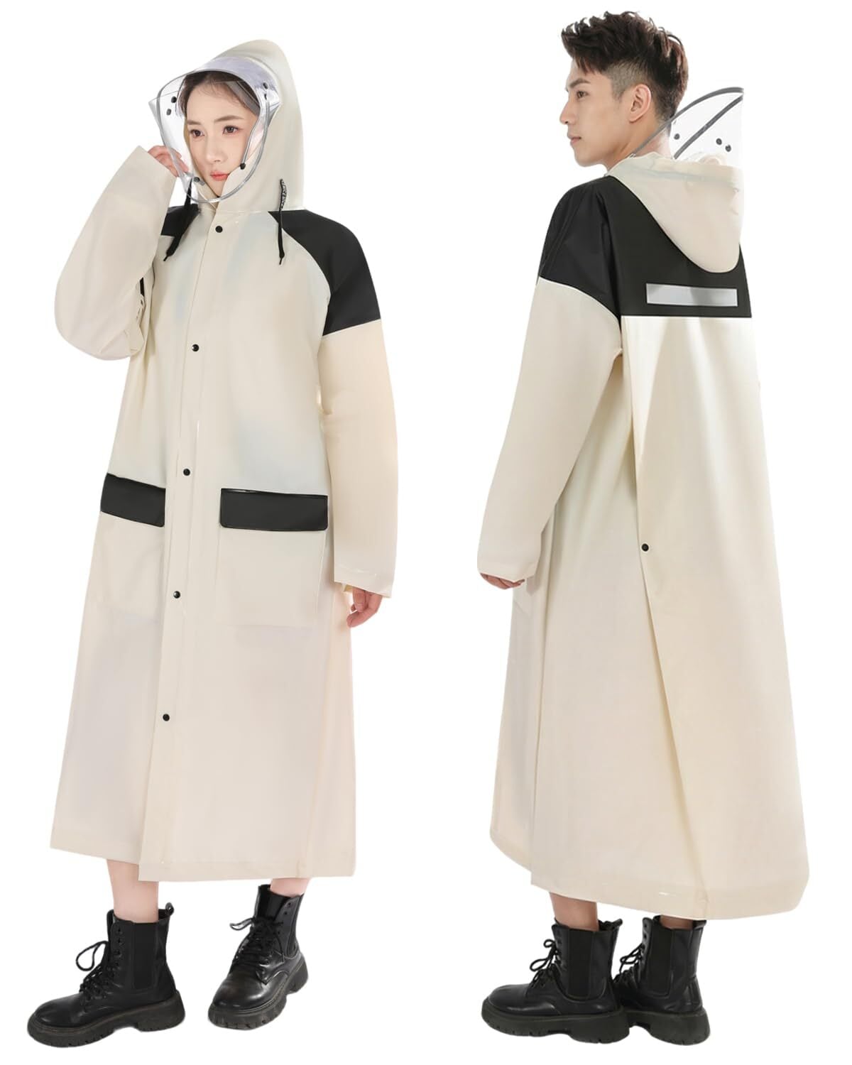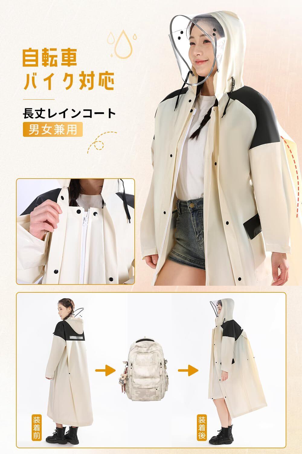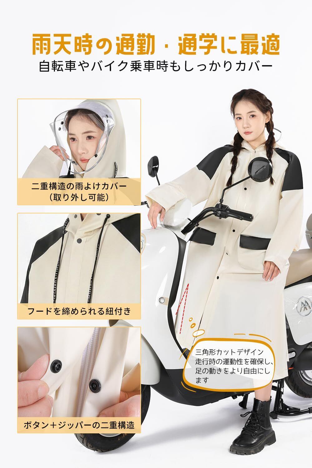 【透明レインフード付き】 付属のフードをレインコートのフードに取り付けると、透明な二重フードが形成され、頭全体を完全に覆います。視界をクリアに保ちながら、風・雨・雪から顔を保護します。フードには調節可能な紐が付いており、雨の侵入を防ぎます。自転車・バイク・スクーターなどでの使用に最適で、視界を遮りません。レインコート 自転車として、また機能的なカッパとして、快適にご使用いただけます。【注意!!!】ご使用前に両サイドのフィルムを剥がしてください。剥離:輸送中の傷や汚れを防ぐ高品質保護シールが両サイドに貼られています。